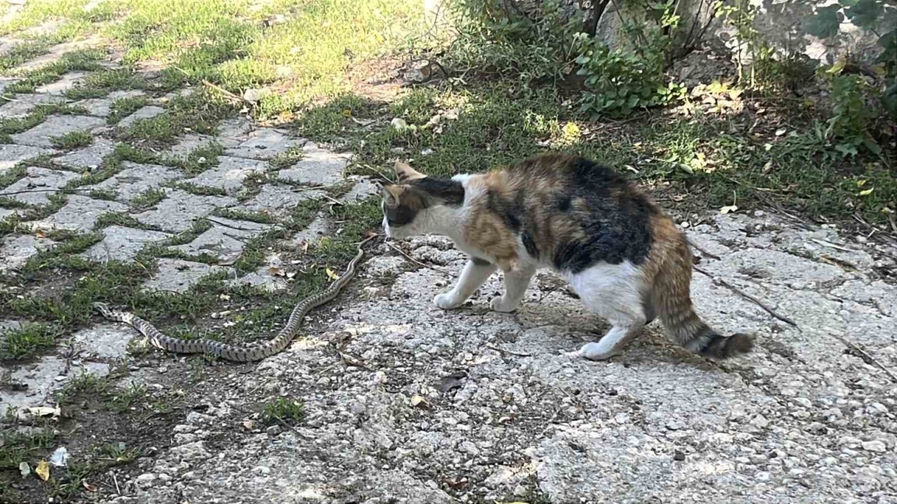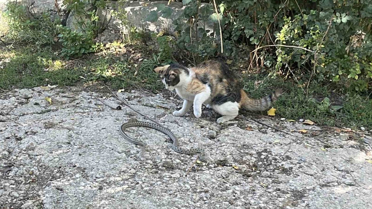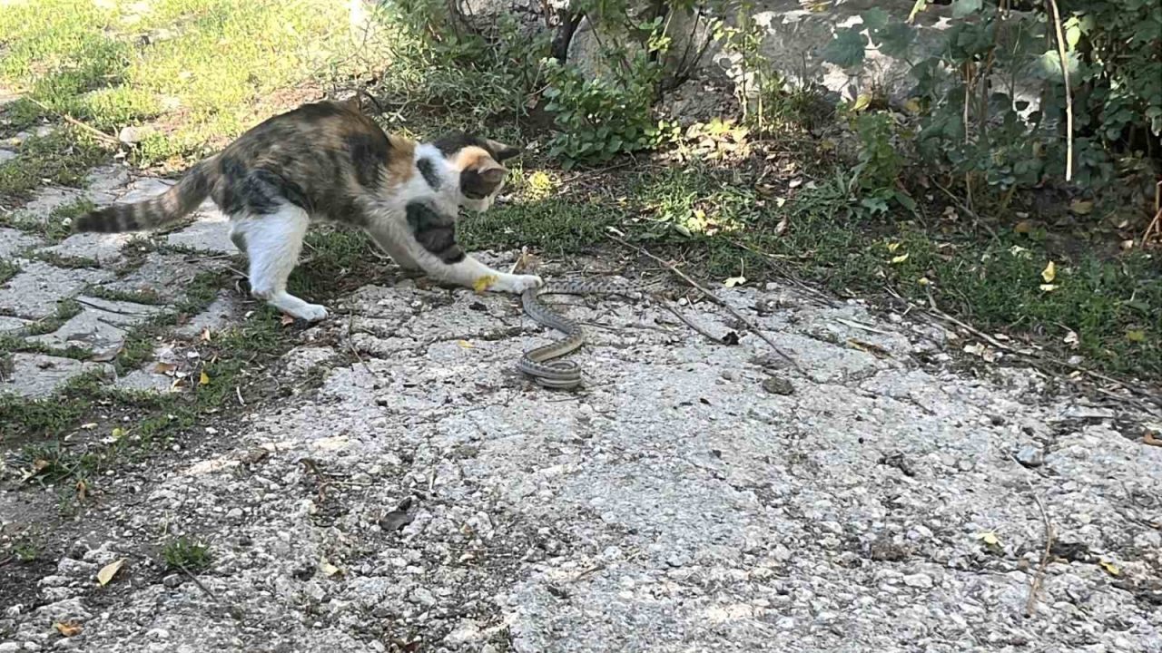 Görüntülerde, kedinin yılana yaklaşarak dikkatlice izlediği, ardından da pati darbeleriyle saldırdığı görülüyor. Bir süre karşı koymaya çalışan yılan, kedinin darbeleri sonrası hareketsiz kaldı. Kedi, öldürdüğü yılanı ağzına alarak, çevredeki eski bir yapının çatısına çıktı.