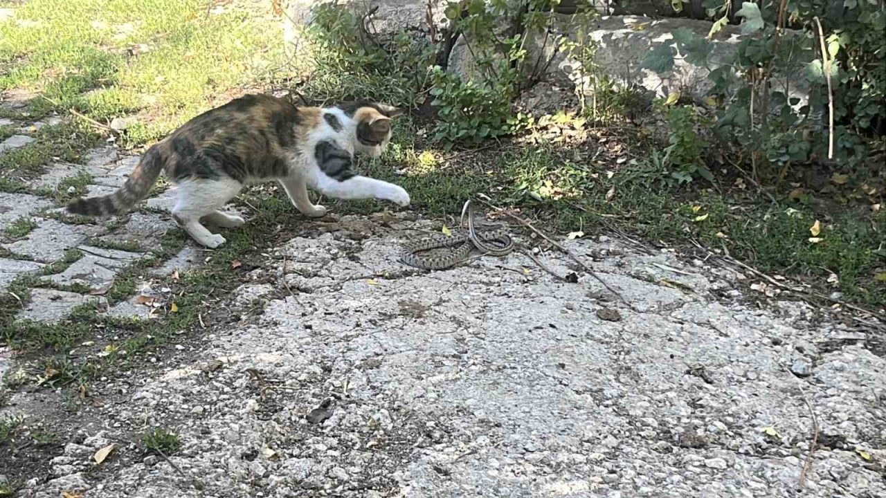 Bayburt’ta bir kediyle yılan arasında yaşanan mücadele cep telefonu kamerasına yansıdı. Fareyle oynar gibi yılanla oynayan kedi, yılana vurduğu pati darbeleriyle yılanı etkisiz hale getirdi.