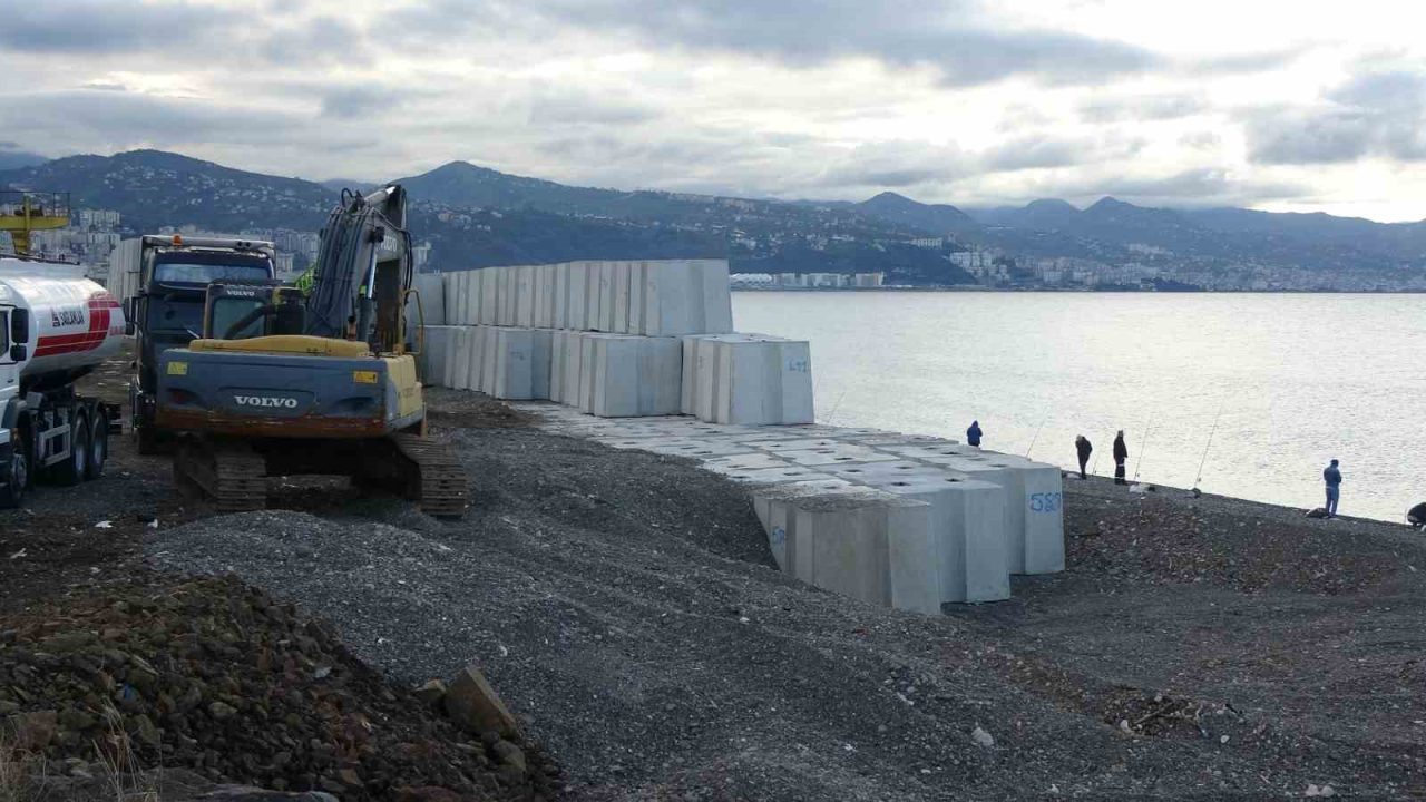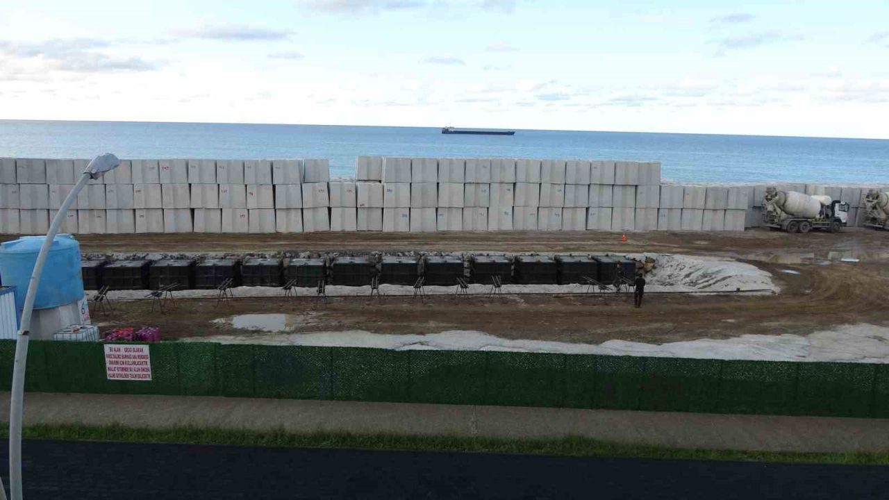 Trabzon’un önemli balıkçı limanlarından Faroz Limanı’nın dev dalgalardan etkilenmemesi için limanın deniz tarafına 21 tonluk dev betonların döküm işlemi sürüyor.