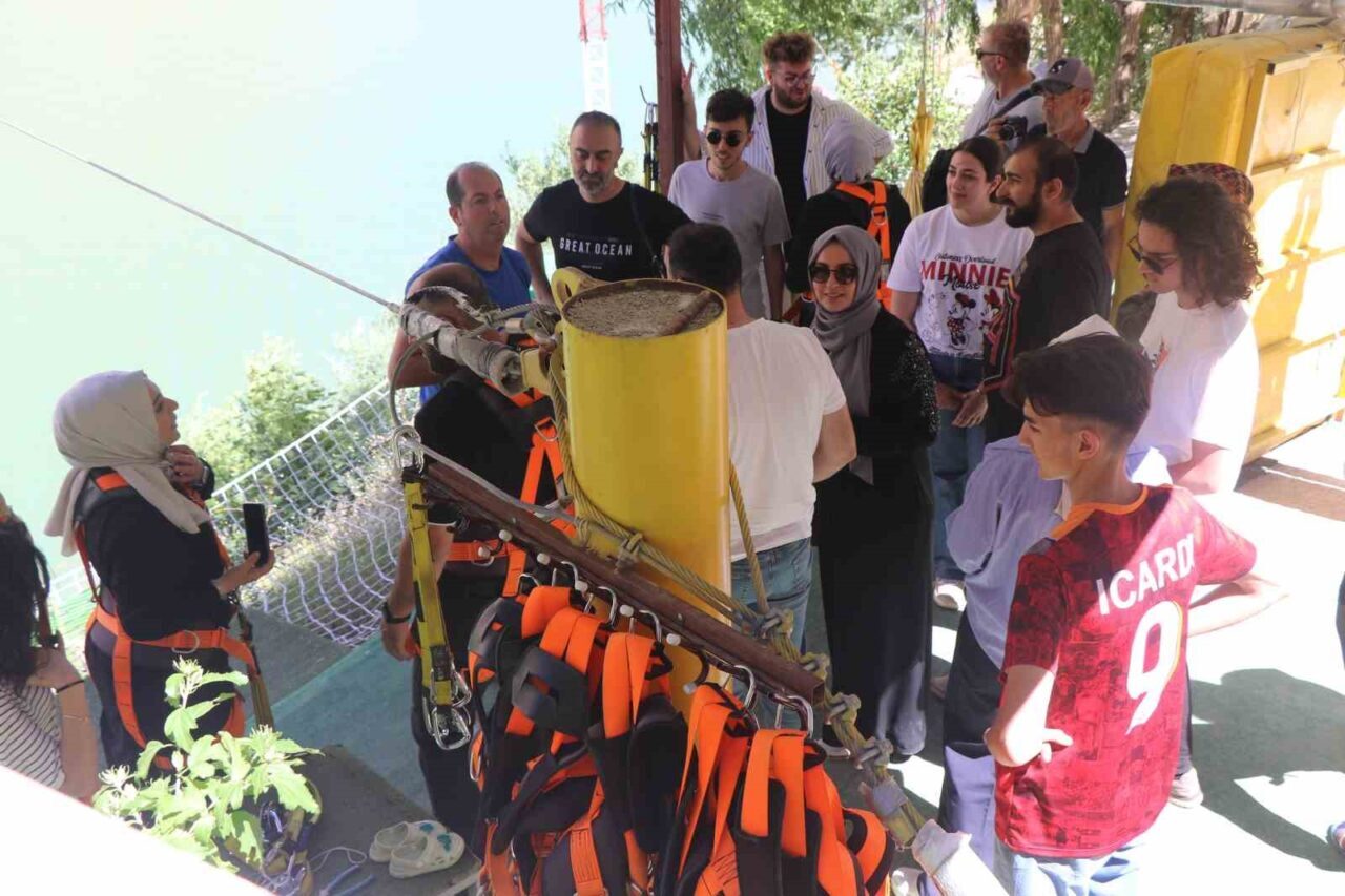 Erzincan’ın gözde ilçesi Kemaliye’de yer alan Karanlık Kanyon’da kurulan zipline, macera severlerin akınına uğradı.