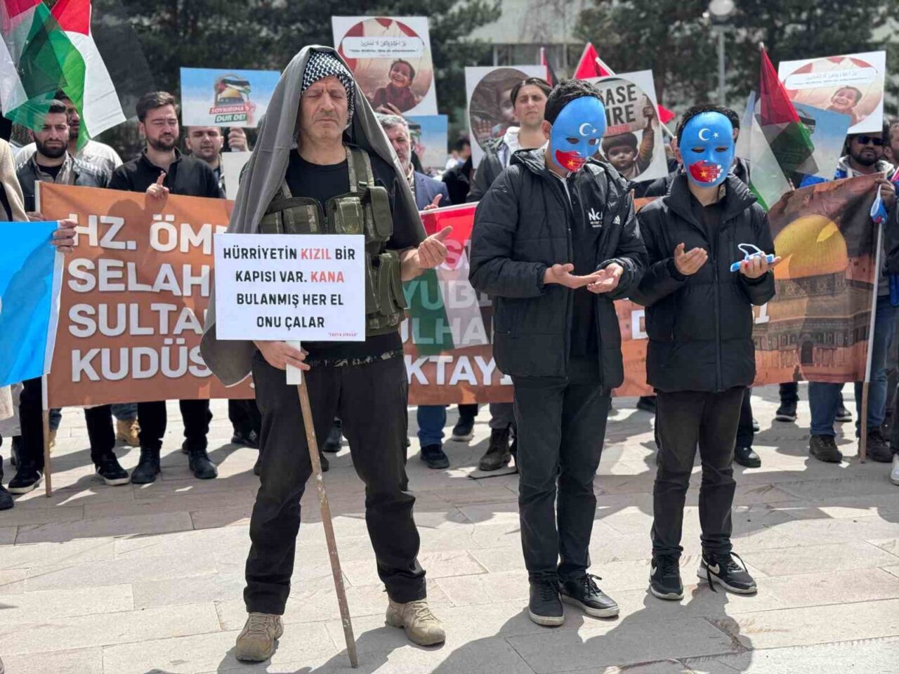 İnsan Hak ve Hürriyetleri İnsani Yardım Derneği’nde görevli Emre Arpa, yürüyüşün ardından bir konuşma yaparak, “Dünyanın 2 farklı noktasında aynı acıyı yaşayanların sesi olmak için toplandık. Gazze’nin yıllardır saldırı altında. Sadece toprakları değil hayalleri de bombalanan bir halktan bahsediyoruz. Kadınlar, çocuklar ve yaşlılar savaşın en ağır yükünü taşıyan masum sivillerin hayatları her gün biraz daha karartılıyor. Hiçbir kural ve ilke, bu zulmü durdurmaya yetmiyor. Çünkü çıkarlar vicdanın önüne geçmiş durumda. Doğu Türkistan’da kardeşlerimizin ana dillerinde konuşmalarına, ibadet etmelerine ve kimliklerini yaşamalarına izin verilmiyor. Tarih ve kültürleri sistematik şekilde yok edilmeye çalışılıyor. Toplama kampları, dijital gözetim sistemleri ve baskı politikalarıyla bir milletin hafızası silinmeye çalışılıyor” diye konuştu.