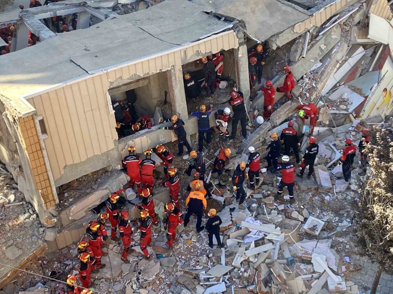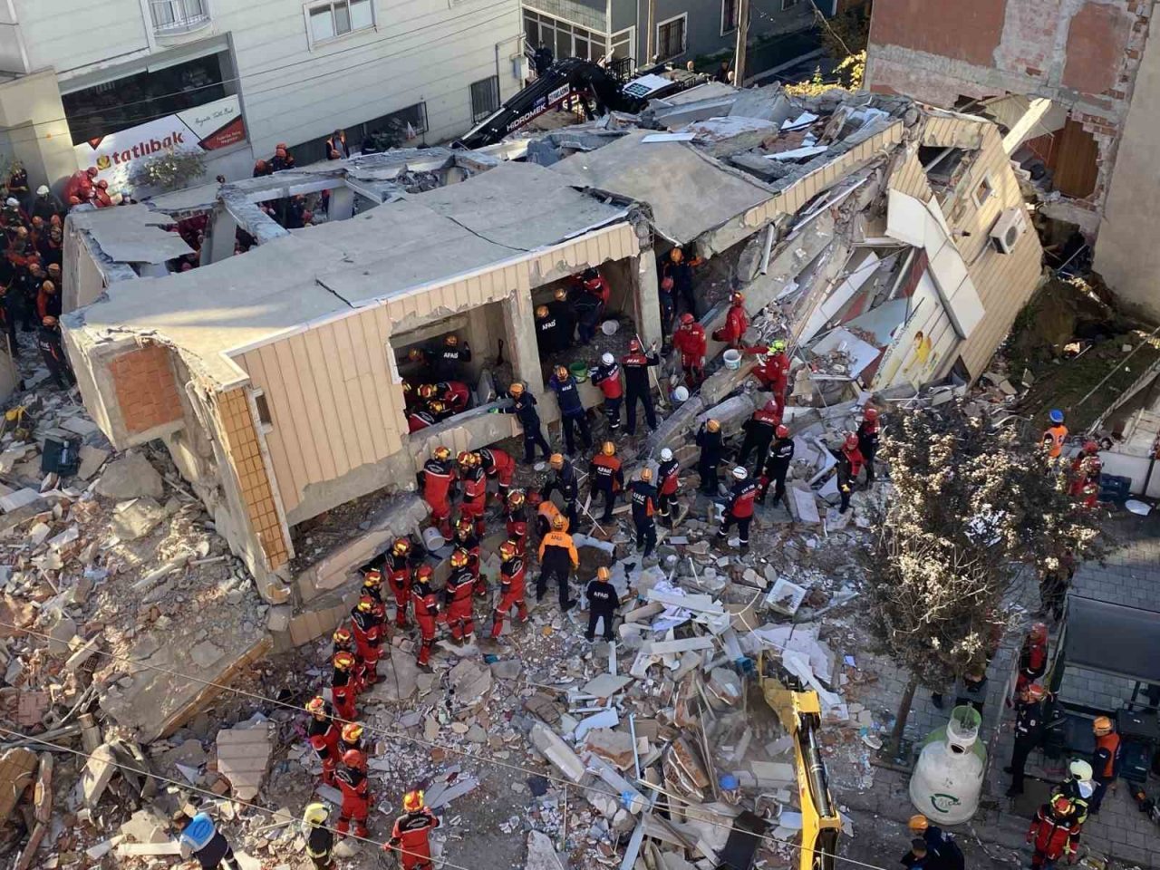 Kocaeli’nin Gebze ilçesinde çöken 6 katlı binanın enkazı ve ekiplerin arama kurtarma çalışmaları dron ile havadan görüntülendi.