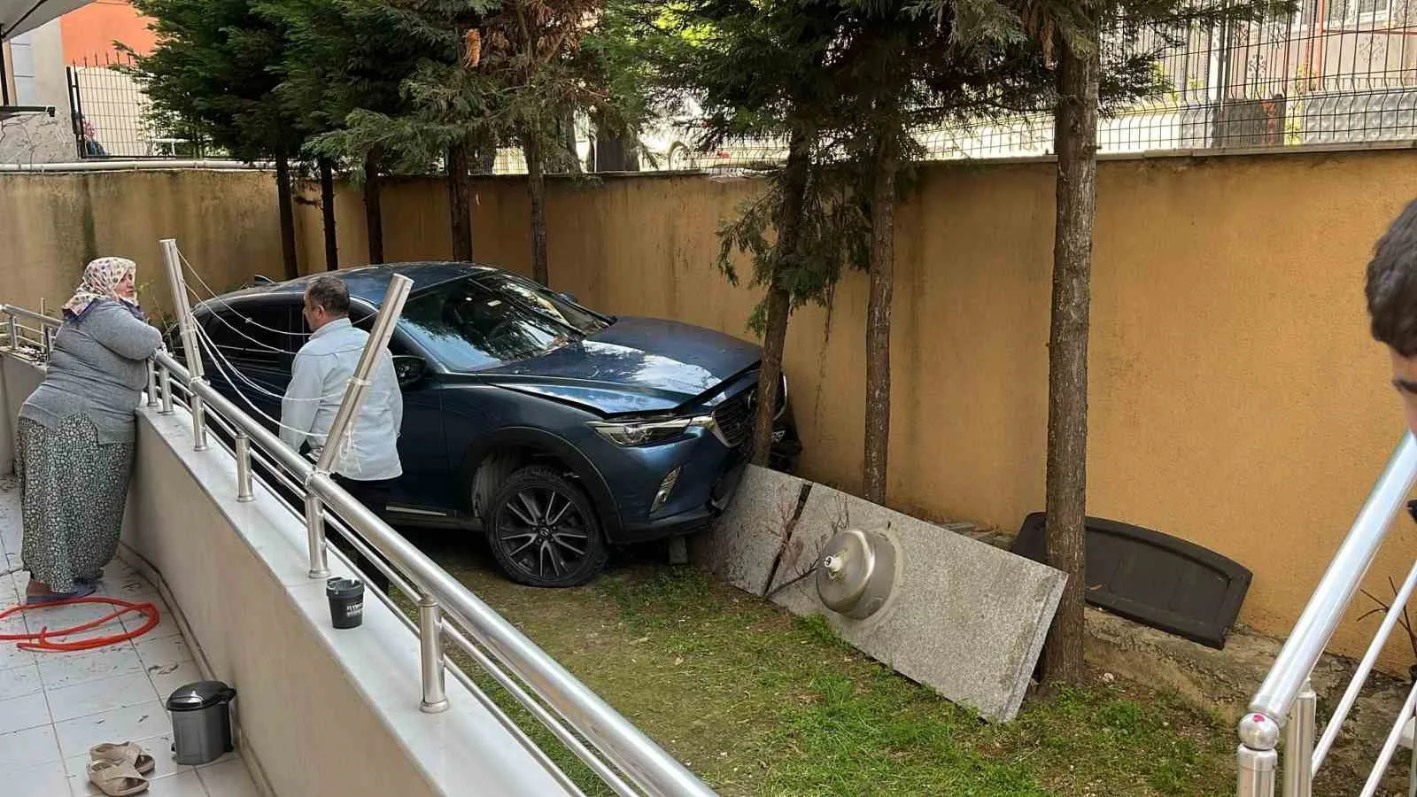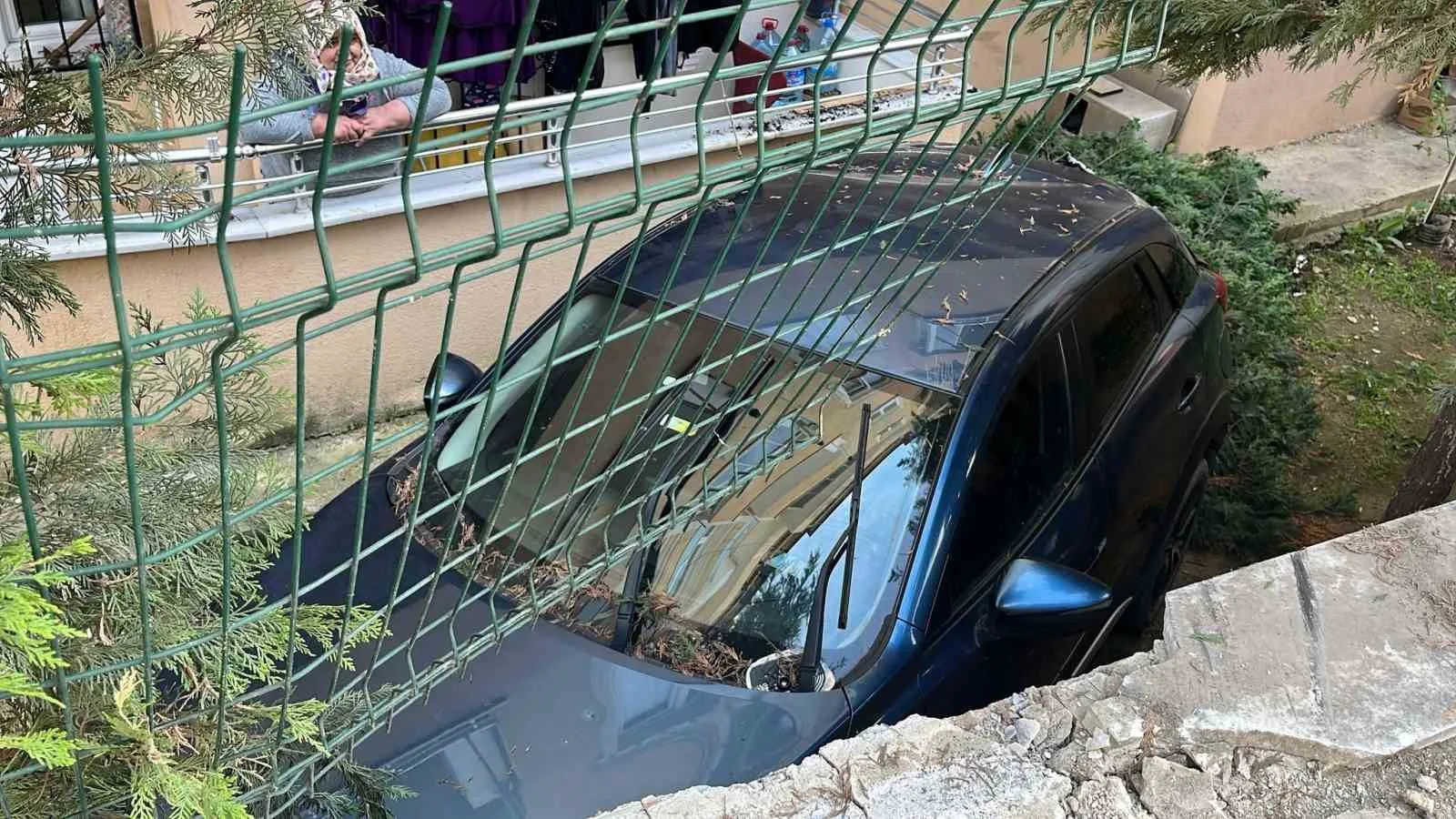 Kocaeli’nin Gebze ilçesinde geri manevra yapan otomobil kontrolden çıkarak yaklaşık 3 metre yükseklikteki duvarı aşıp binanın bahçesine düştü. Kazada, araçta yolcu olarak bulunan 1 kişi yaralandı.