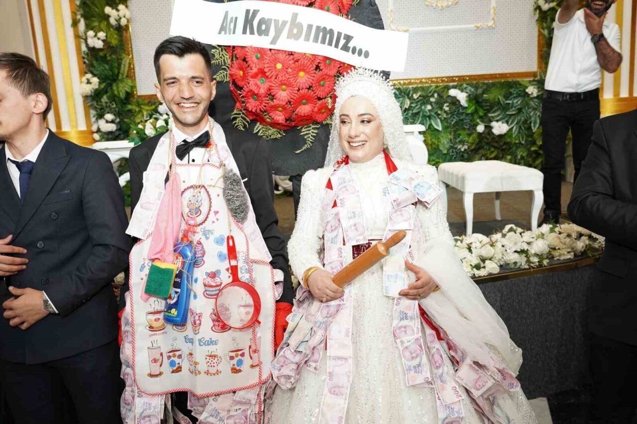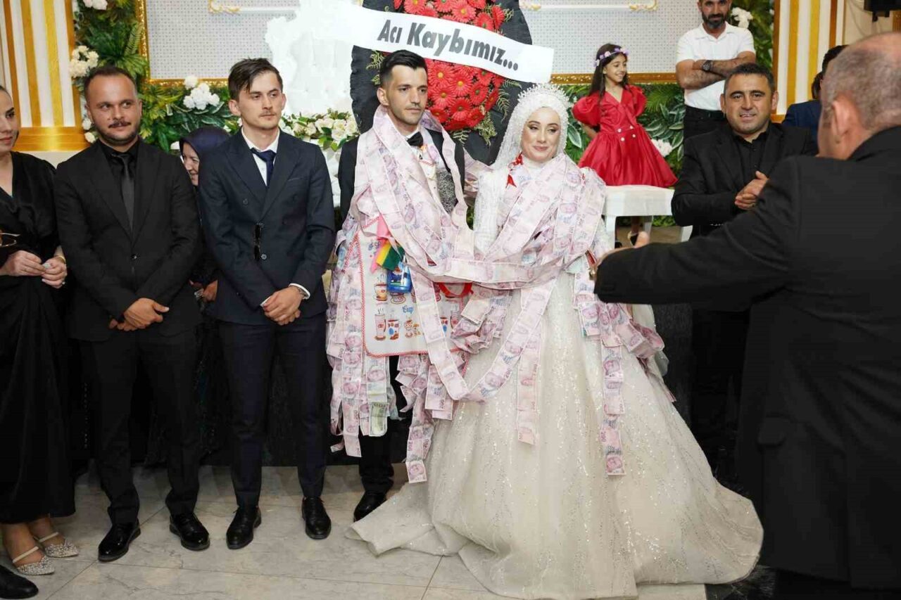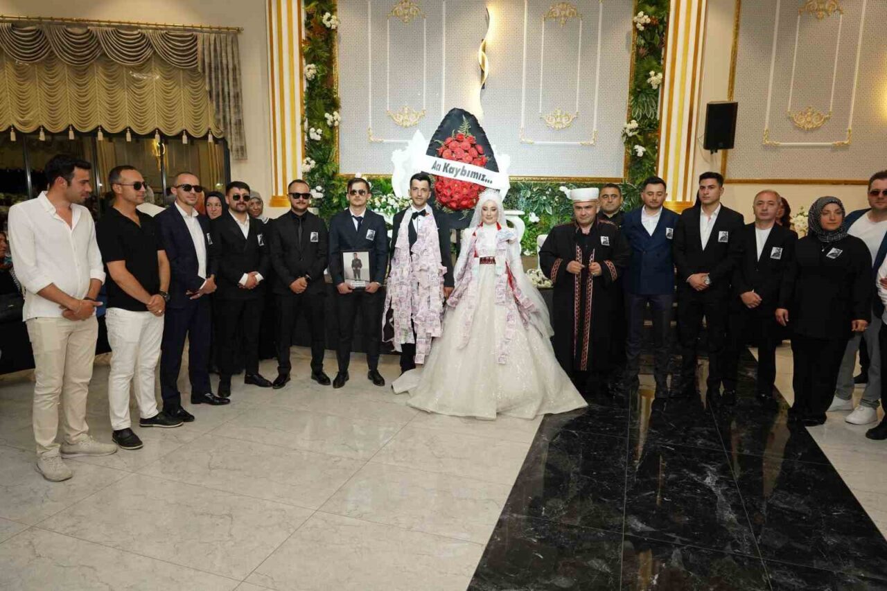 GELİN VE DAMADIN MESAİ ARKADAŞLARI SALONA ‘ACI KAYBIMIZ’ YAZILI ÇELENK VE TEMSİLİ İMAM İLE GİRDİ