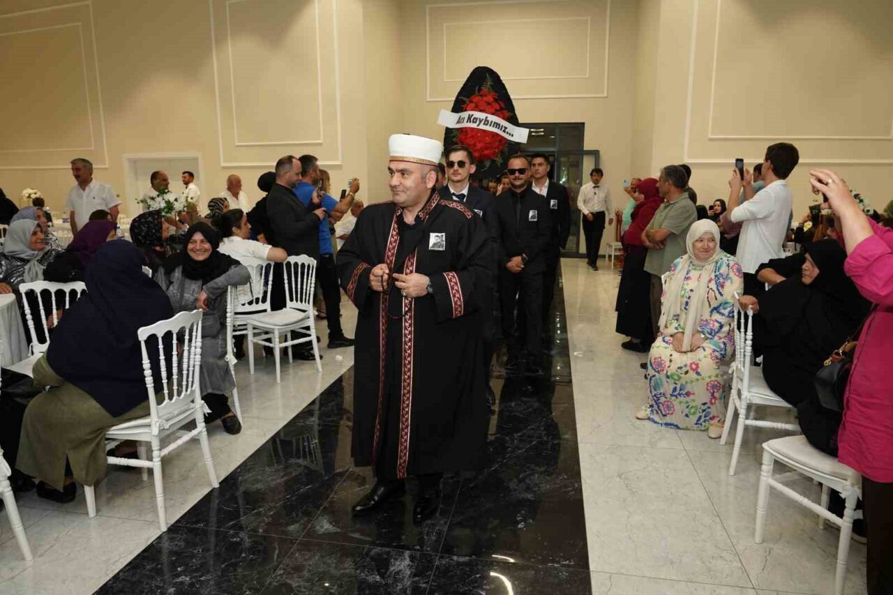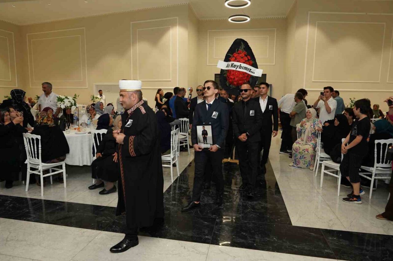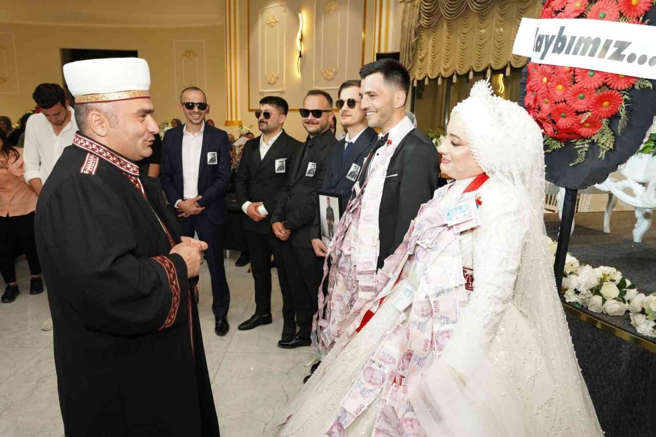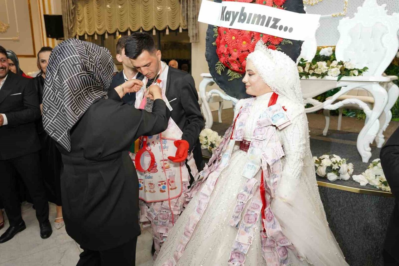 GELİN VE DAMADIN MESAİ ARKADAŞLARI SALONA ‘ACI KAYBIMIZ’ YAZILI ÇELENK VE TEMSİLİ İMAM İLE GİRDİ