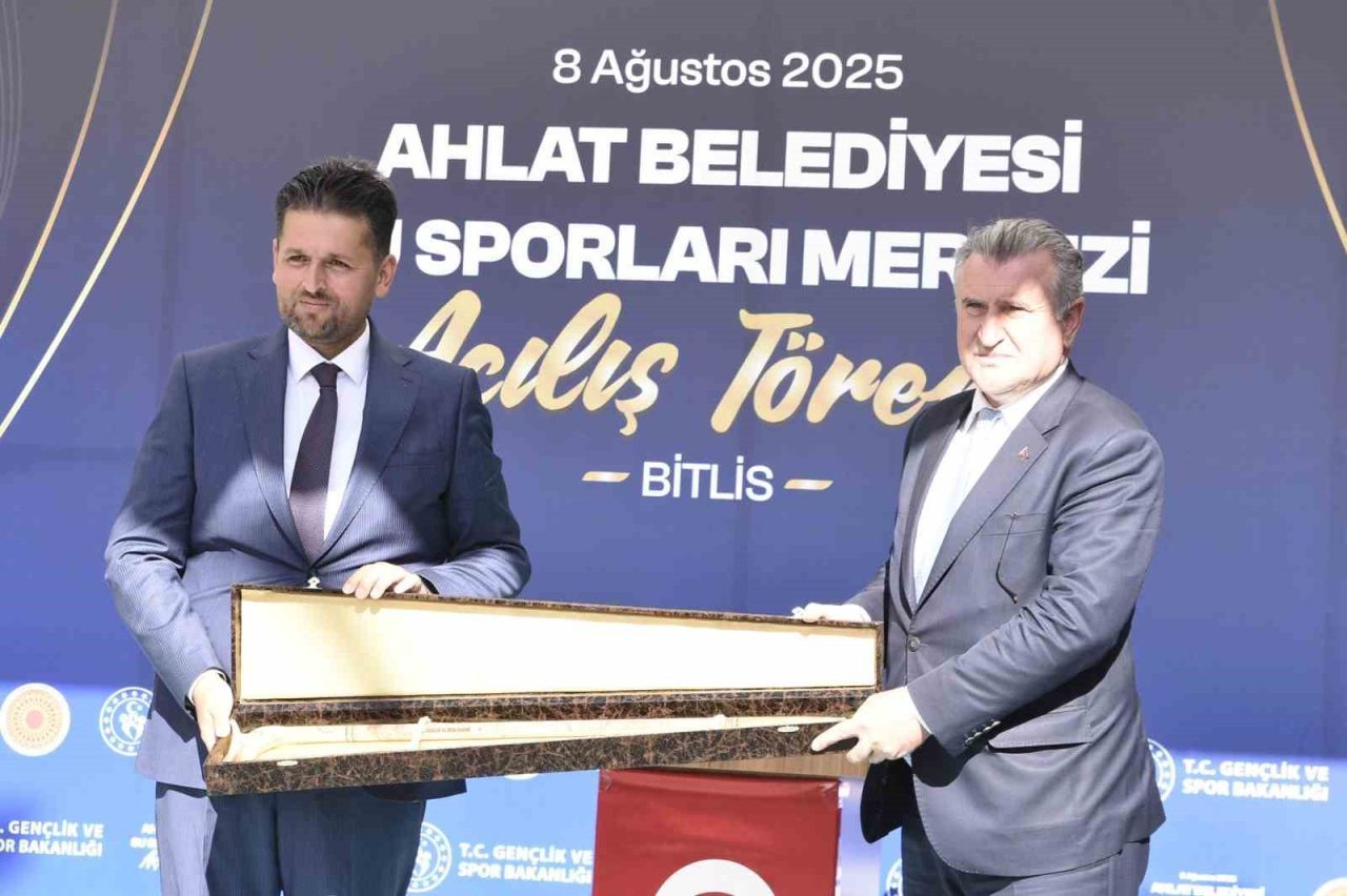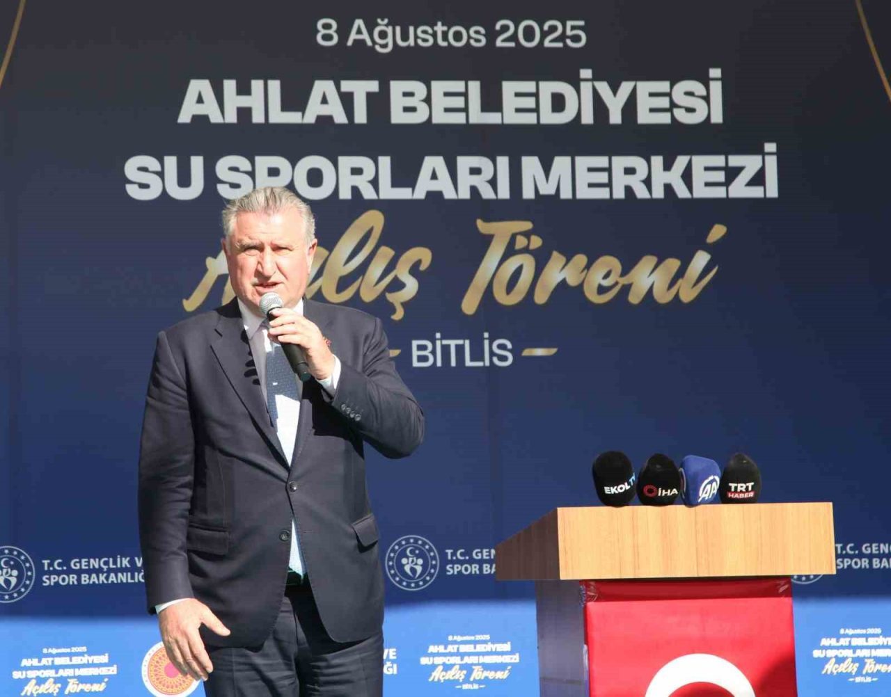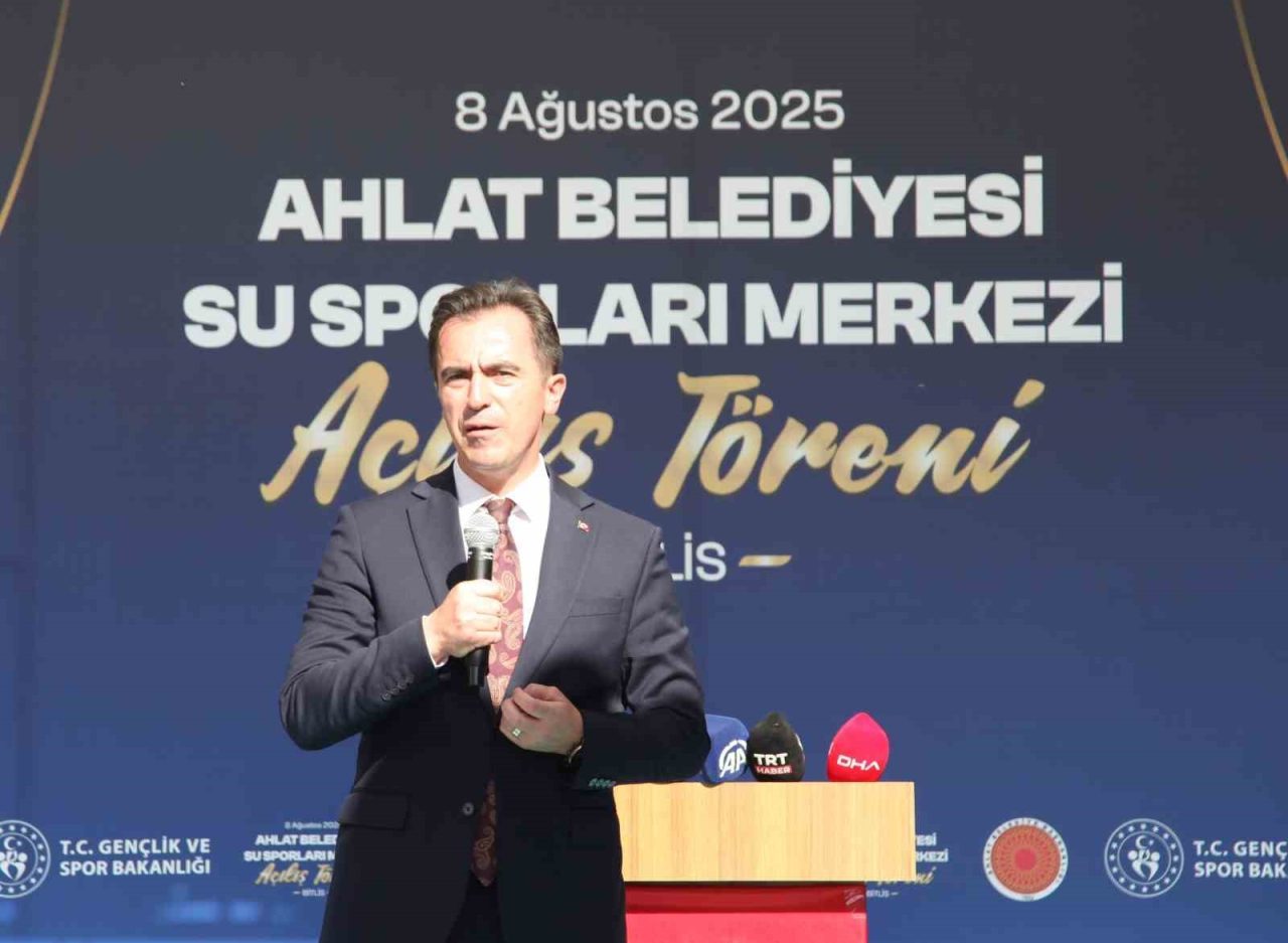 Ahlat’ın Tunus Mahallesi’nde Van Gölü kenarında inşa edilen Su Sporları Merkezi açılışında konuşan Bakan Bak, “Gençlik ve Spor Bakanlığı olarak Bitlis’te çeşitli yatırım protokollerini imzalamak ve yeni yatırımların müjdesini vermek üzere geldik. Güroymak’ta bir gençlik merkezi için protokol imzaladık. Hizan’a salon ve yüzme havuzu başta olmak üzere yatırımlar, halı sahalar, Bitlis merkezde yaptığımız halı sahalar ile ilgili protokoller, yine Adilcevaz’da yarı olimpik bir yüzme havuzu için buradayız. Ve Bitlis’te güzel projelere devam edeceğiz. Gençlik ve Spor Bakanlığı olarak Türkiye’nin her yerinde spor yatırımları yapıyoruz. Sayın Cumhurbaşkanımızın sporun içinden gelmesi, gençlere spor alanında yatırımlar yapması, gençlere güvenmesi ve Türkiye’nin dört bir yanındaki mahallelerden tutun da köylerine kadar spor tesisleri kazandırılması için verdiği talimatlar doğrultusunda çalışmaya devam ediyoruz. Türkiye’de modern stadyumlar, kapalı spor salonları ve yüzme havuzları başta olmak üzere atletizm pistleri ve gençlik kampları pek çok yatırım yapıldı, yapılmaya devam ediyor. Bütün bunlar ülkemizin güzel gençleri için. Gençlik ve Spor Bakanlığı olarak bizim en büyük görevlerimizin bir tanesi de gençlerin sporla buluşmasıdır. Kötü alışkanlıklardan uzak durması, başta dijital bağımlılık, uyuşturucu ve içki olmak üzere gençlerimizi bağımlı hale getiren alışkanlıklardan uzak tutulmasıdır. Buradan ailelere sesleniyorum; çocuklarınızı yüzme havuzlarımıza spor tesislerimize spor alanlarımıza getirelim. Onların yaz spor okulları ve kulüplerimizle hizmet etmeye devam ediyoruz” dedi.