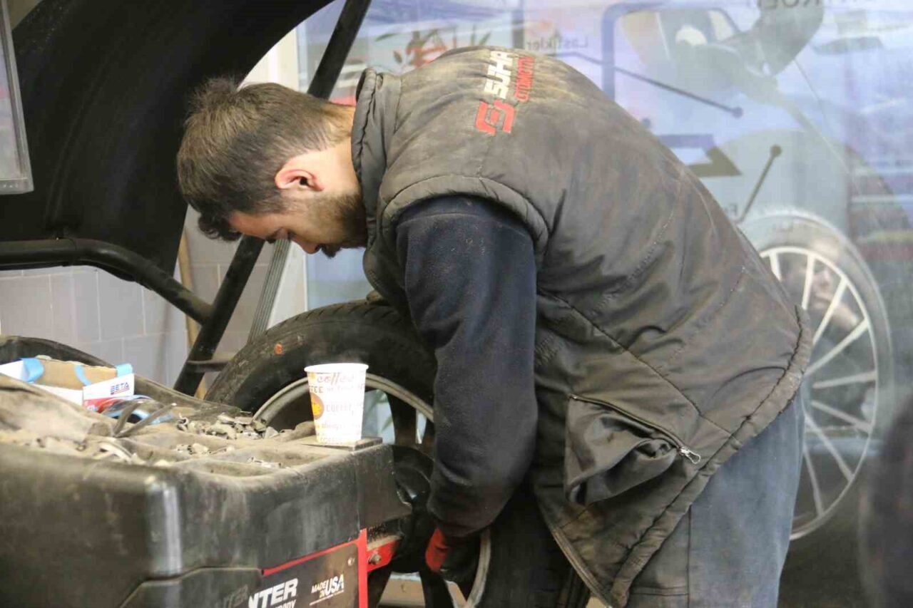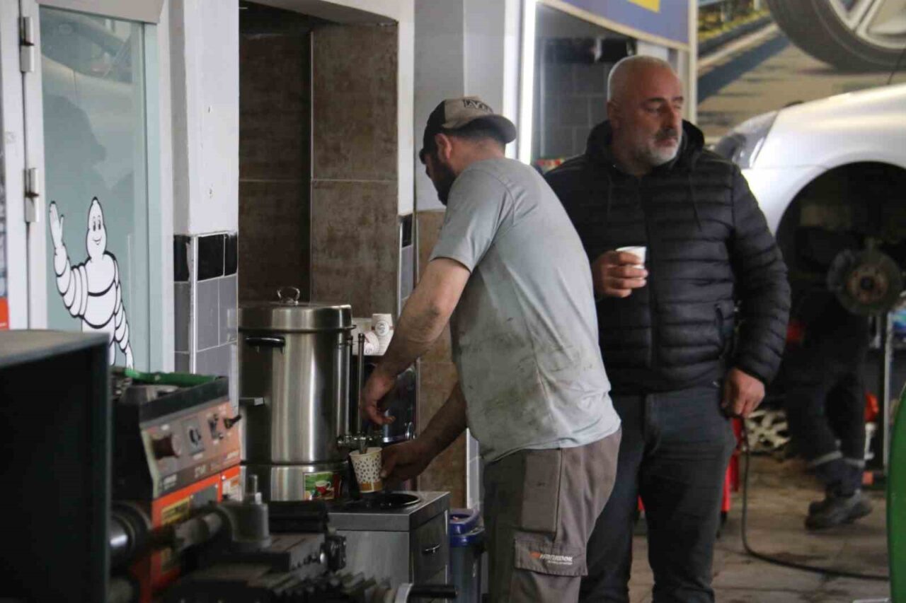 Sivas’ta Ata Sanayi Sitesi’nde hizmet veren bir lastikçi dükkanı işlerini aksatmamak ve müşterilerini mağdur etmemek için bu özel günde de çalıştı. Sabahın erken saatlerinde kepenk açan esnaf, otomobil lastikleri değiştirerek, evlerine ekmek götürme derdine düştü.