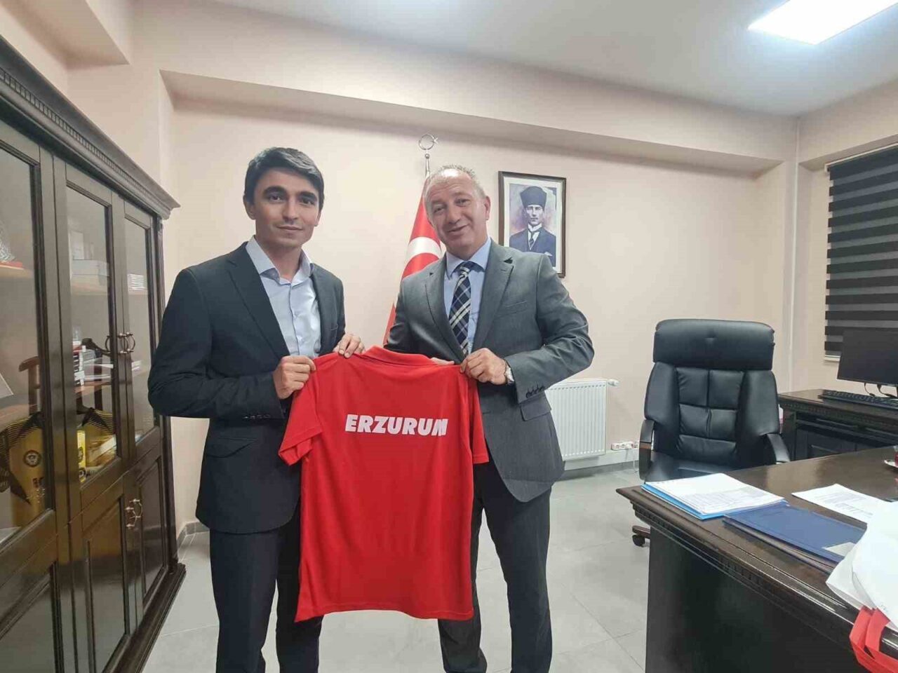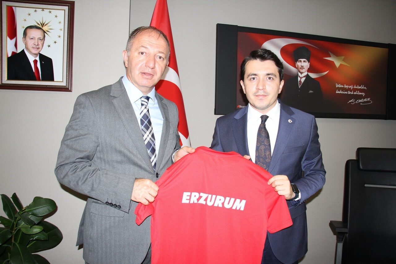 Tekman Kaymakamı Hüseyin Demirkol’a ’hayırlı olsun’ dileklerini ileten Erzurum Gençlik ve Spor İl Müdürü Levent Çakmur, Kaymakam Demirkol’a ‘Erzurum’ yazılı forma hediye etti.