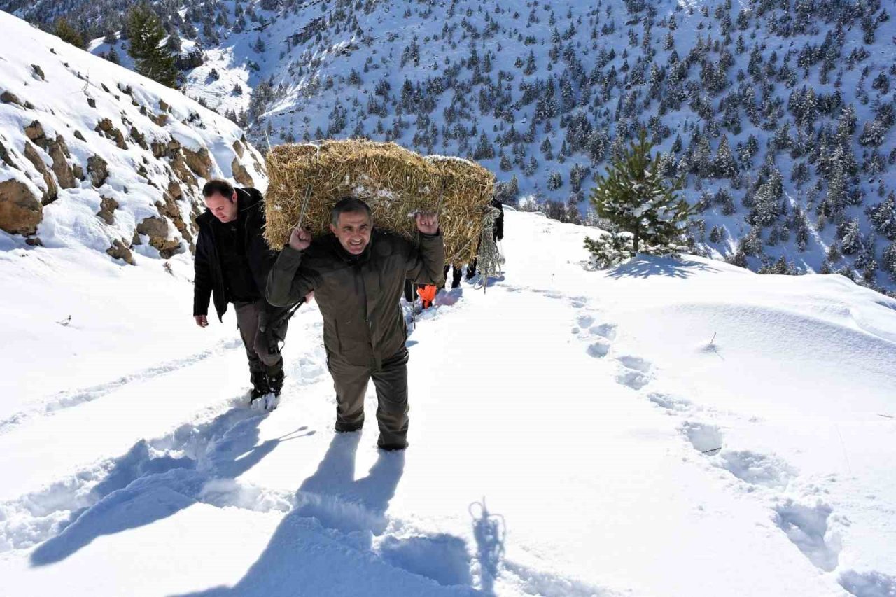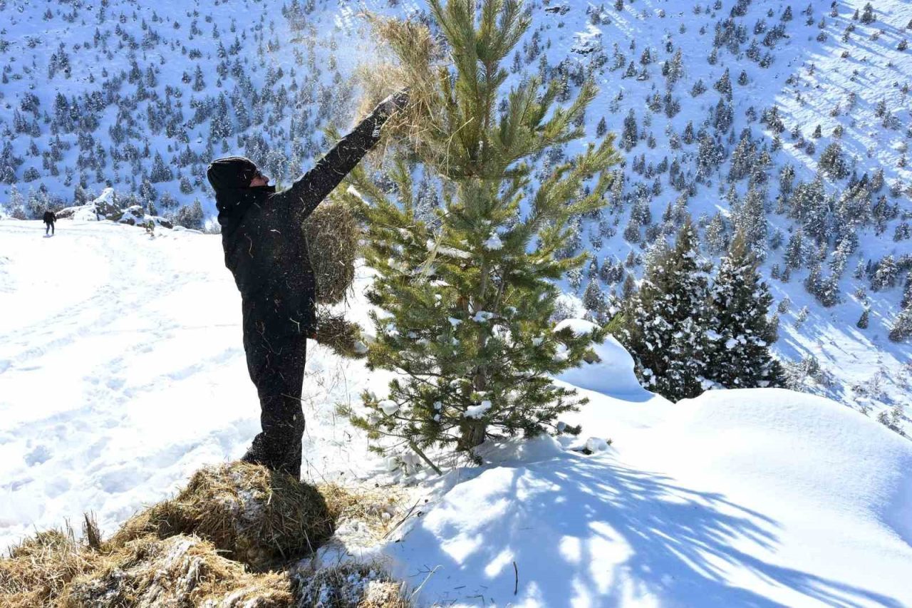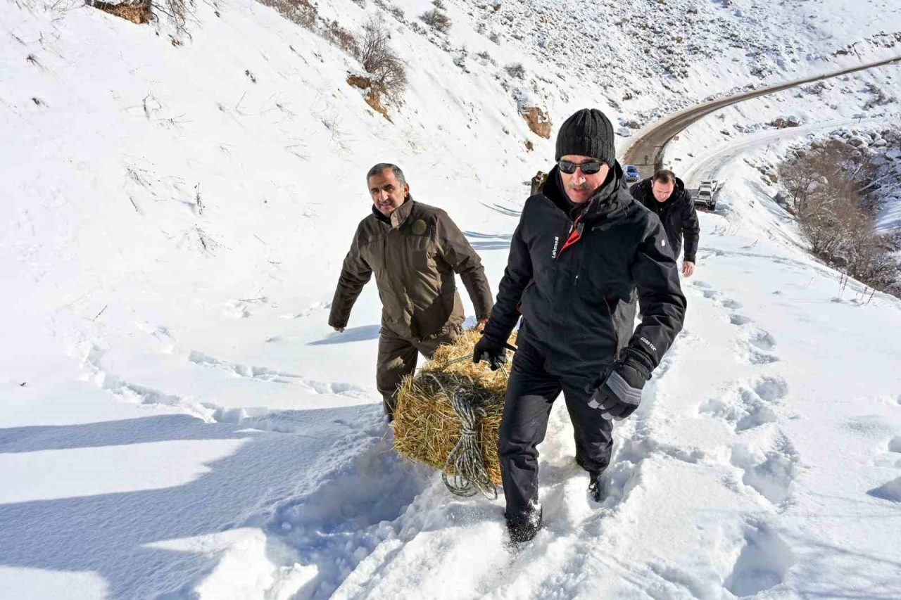 Ekiplerle omuz omuza vererek karla kaplı zeminde ot ve buğday çuvallarını taşıyan Vali Aydın Baruş, bu malzemeleri başta yaban keçileri olmak üzere yaban hayvanlarının kolaylıkla ulaşabileceği ve güvenle beslenebileceği şekilde bıraktı.