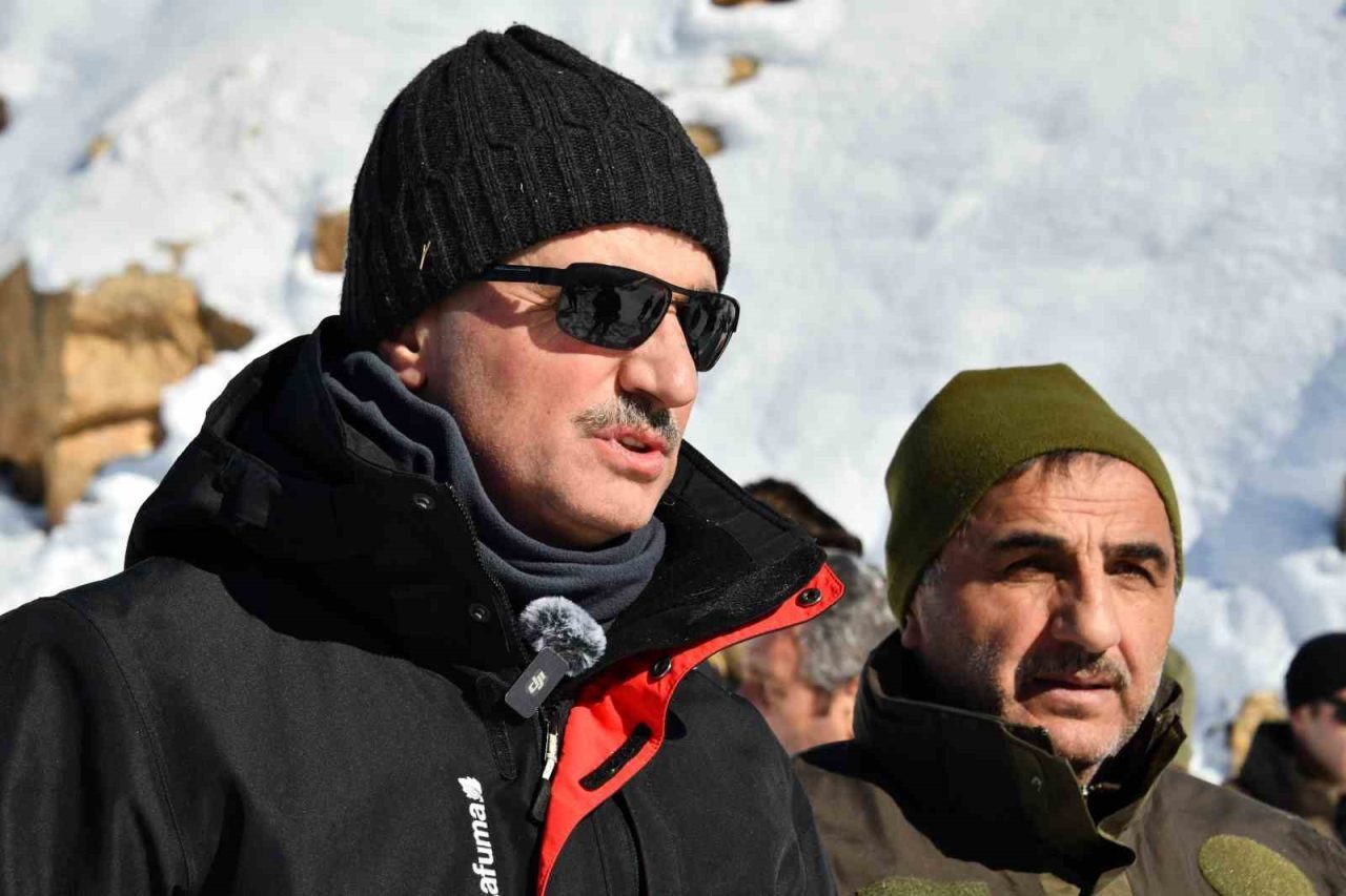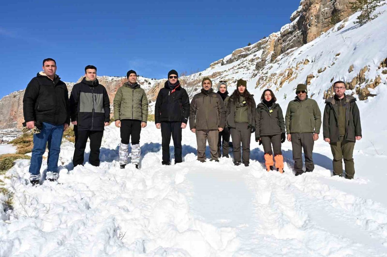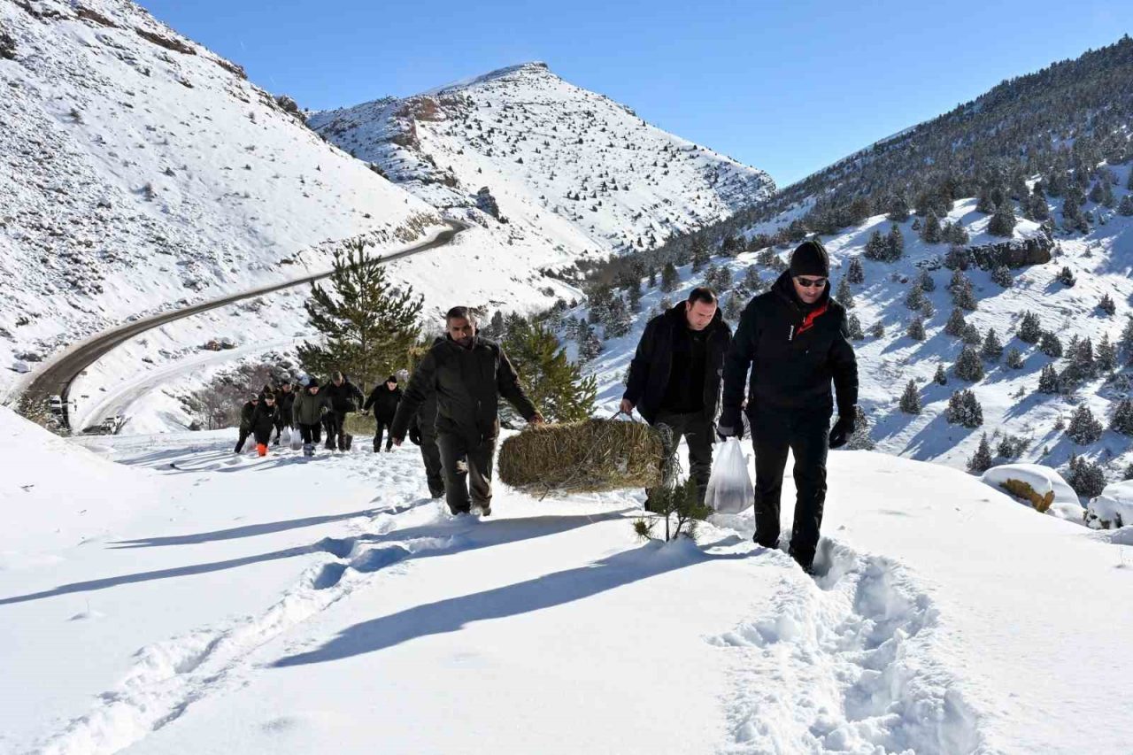 Ekiplerle omuz omuza vererek karla kaplı zeminde ot ve buğday çuvallarını taşıyan Vali Aydın Baruş, bu malzemeleri başta yaban keçileri olmak üzere yaban hayvanlarının kolaylıkla ulaşabileceği ve güvenle beslenebileceği şekilde bıraktı.