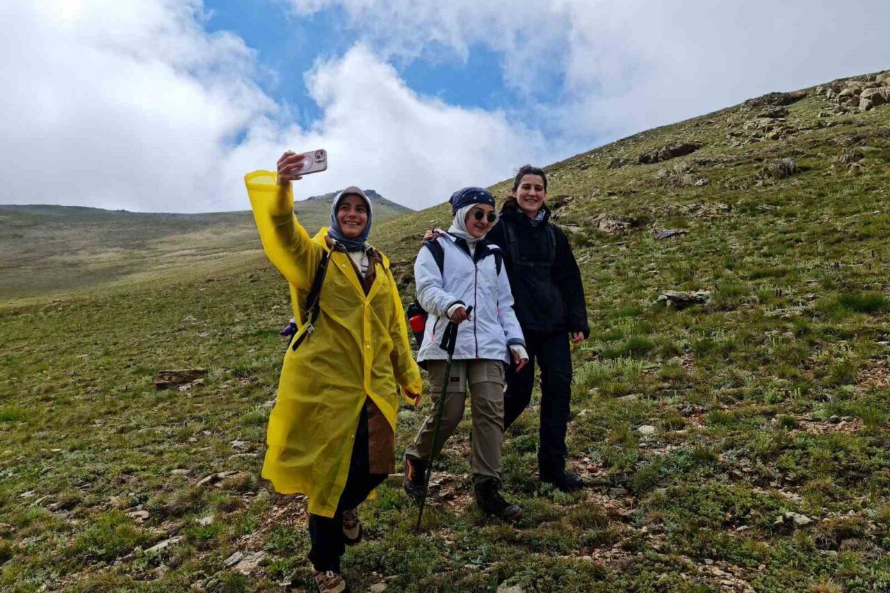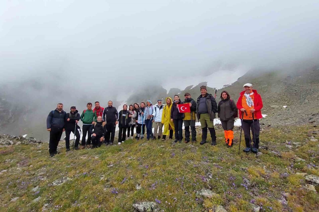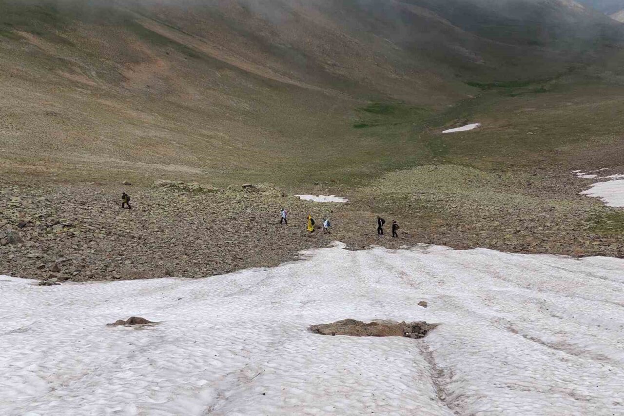 Torul ilçesine bağlı Gümüştuğ köyünün 2 bin 475 metre yüksekliğindeki Yılanlı Yaylası’na kadar araçlarla ulaşan 20 sporcu, buradan başlayan yürüyüşlerinde yaklaşık 3 bin metre rakıma kadar ilerledi.