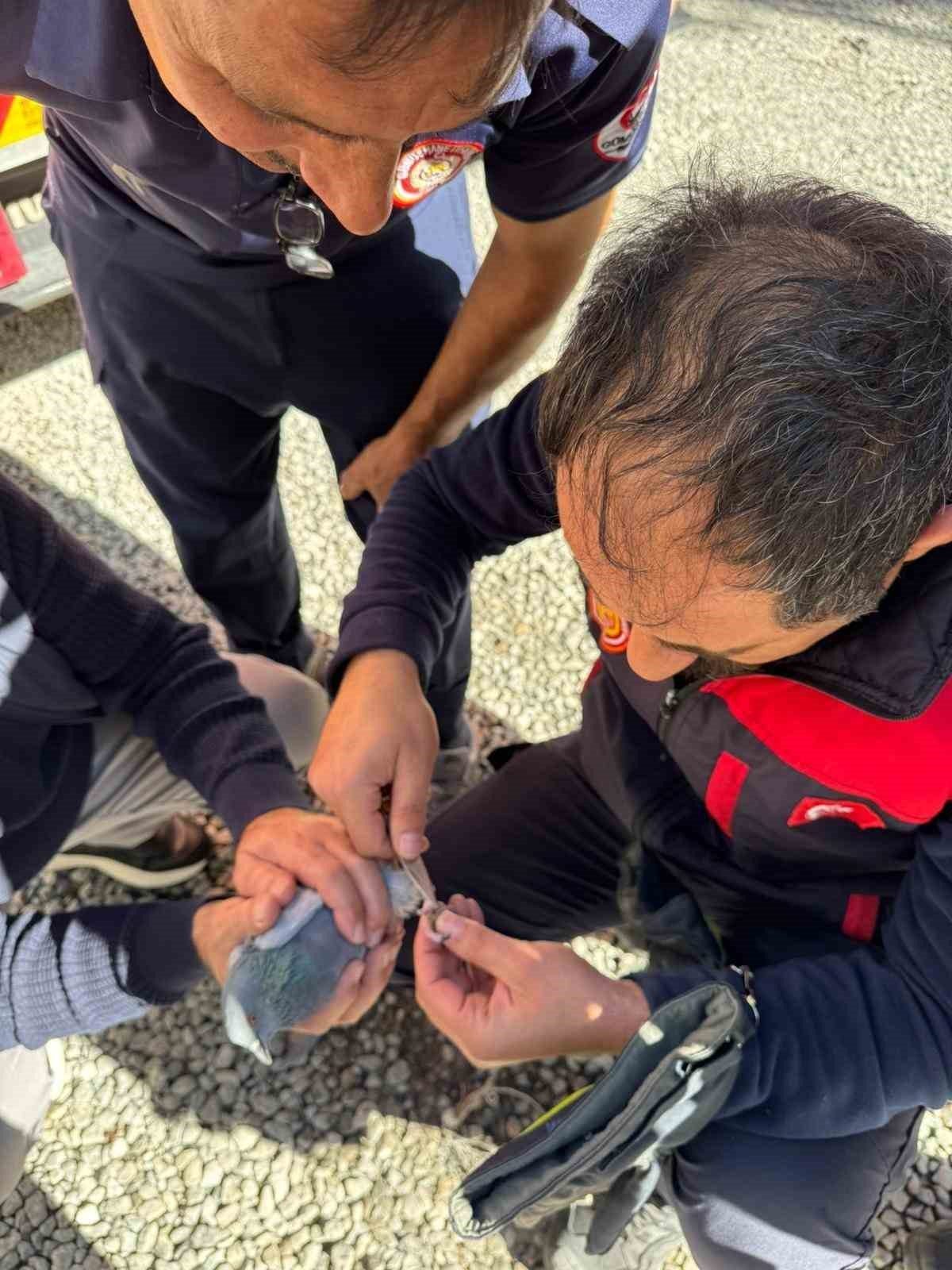 Gümüşhane’de ayakları ipe dolanan güvercin, itfaiye ekiplerinin müdahalesiyle kurtarıldı.