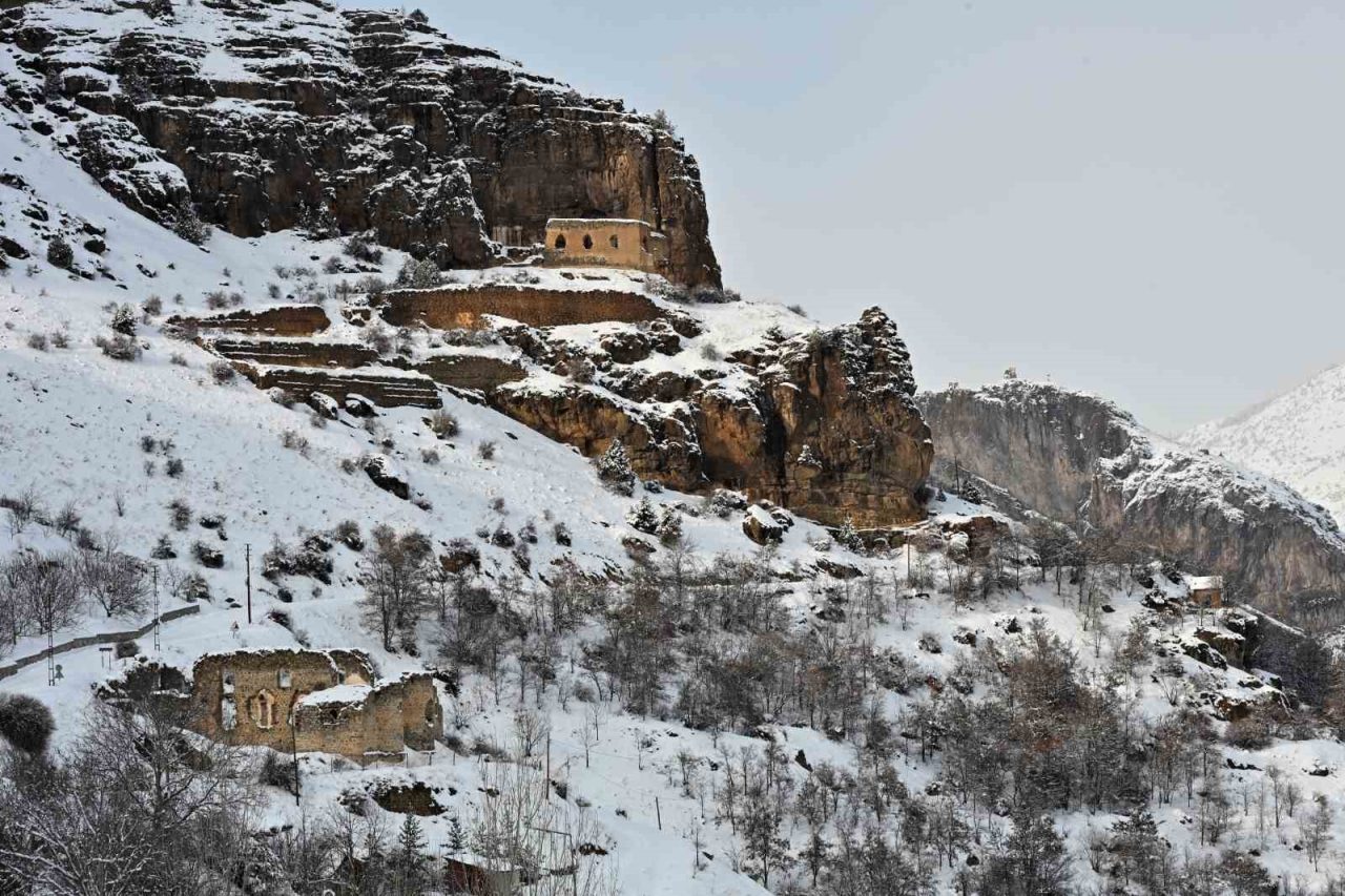 Gümüşhane’nin eski yerleşim yeri olan ve “hoşgörü merkezi” olarak bilinen tarihi Süleymaniye Mahallesi’nde Osmanlı döneminden kalan camiler, tarihi hamamlar ve kiliseler de kar altındaki görüntüsüyle hayran bıraktı. Farklı medeniyetlerin izlerini taşıyan yapıların oluşturduğu bu doku havadan da görüntülendi.