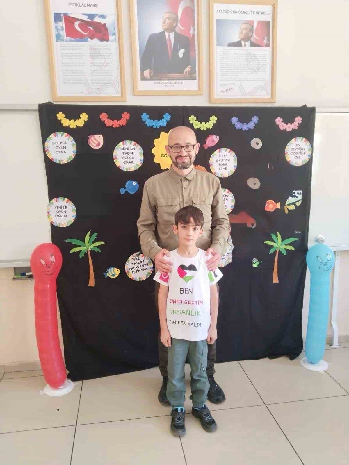 Ömer Tuğra’nın bu anlamlı hareketi çocukların dünyanın dört bir yanındaki acılara ne kadar duyarlı olabildiğinin çarpıcı bir göstergesi olurken, “Gazze’deki kardeşlerimin yaşadığı acıyı hissettim. Karne sevincimi paylaşırken onların acılarını unutmamak için bu tişörtü giydim. İnsanlık bu zulme sessiz kalmasın” ifadelerini kullandı.