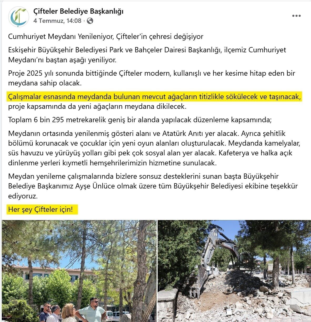 “Cumhuriyet Meydanı yenileniyor, Çifteler’in çehresi değişiyor. Eskişehir Büyükşehir Belediyesi Park ve Bahçeler Dairesi Başkanlığı, ilçemiz Cumhuriyet Meydanı’nı baştan aşağı yeniliyor. Proje 2025 yılı sonunda bittiğinde Çifteler modern, kullanışlı ve her kesime hitap eden bir meydana sahip olacak. Çalışmalar esnasında meydanda bulunan mevcut ağaçlar titizlikle sökülecek ve taşınacak, proje kapsamında da yeni ağaçlar meydana dikilecek.”