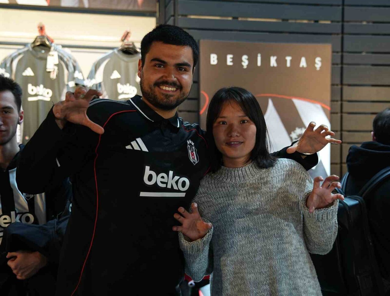 Beşiktaşlı futbolseverler, golcü oyuncuya forma ve atkılarını imzalatırken, hatıra fotoğrafı da çektirdiler.