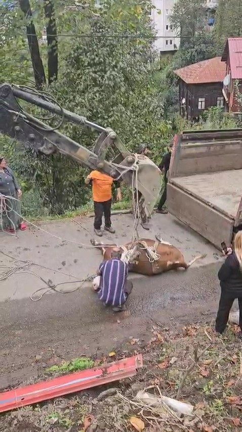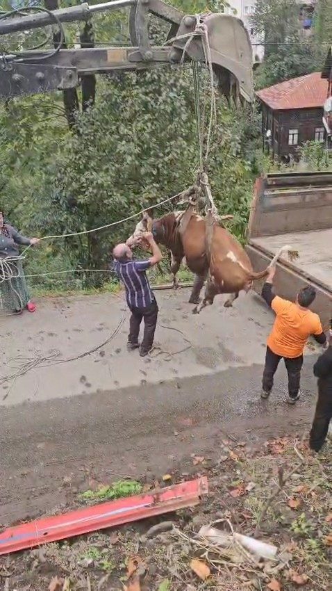 Rize’nin Çamlıhemşin ilçesinde yoldan aşağıya yuvarlanan inek bulunduğu yerden vinçle kurtarıldı.
