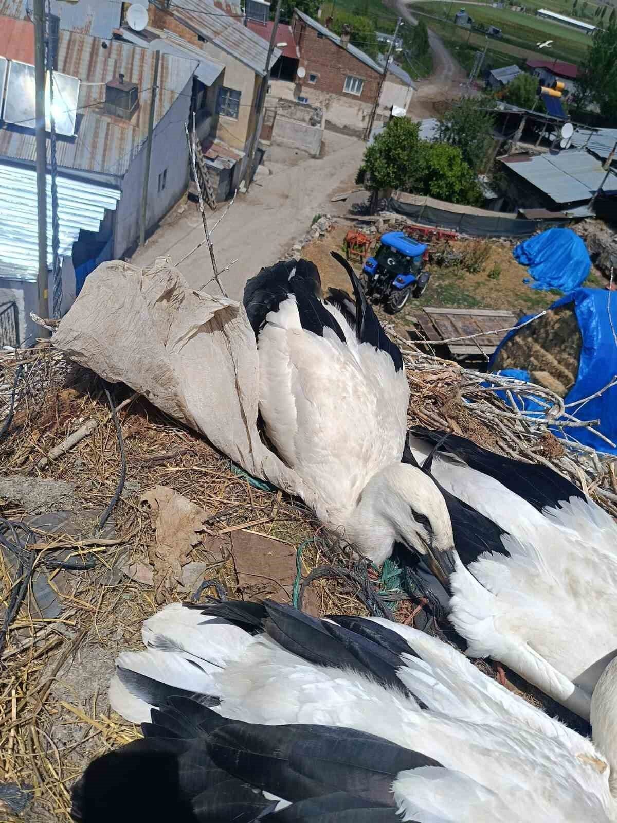 Erzurum’da boynuna poşet dolanan leyleği, itfaiye personeli gerekli müdahaleyi yaparak kurtardı.