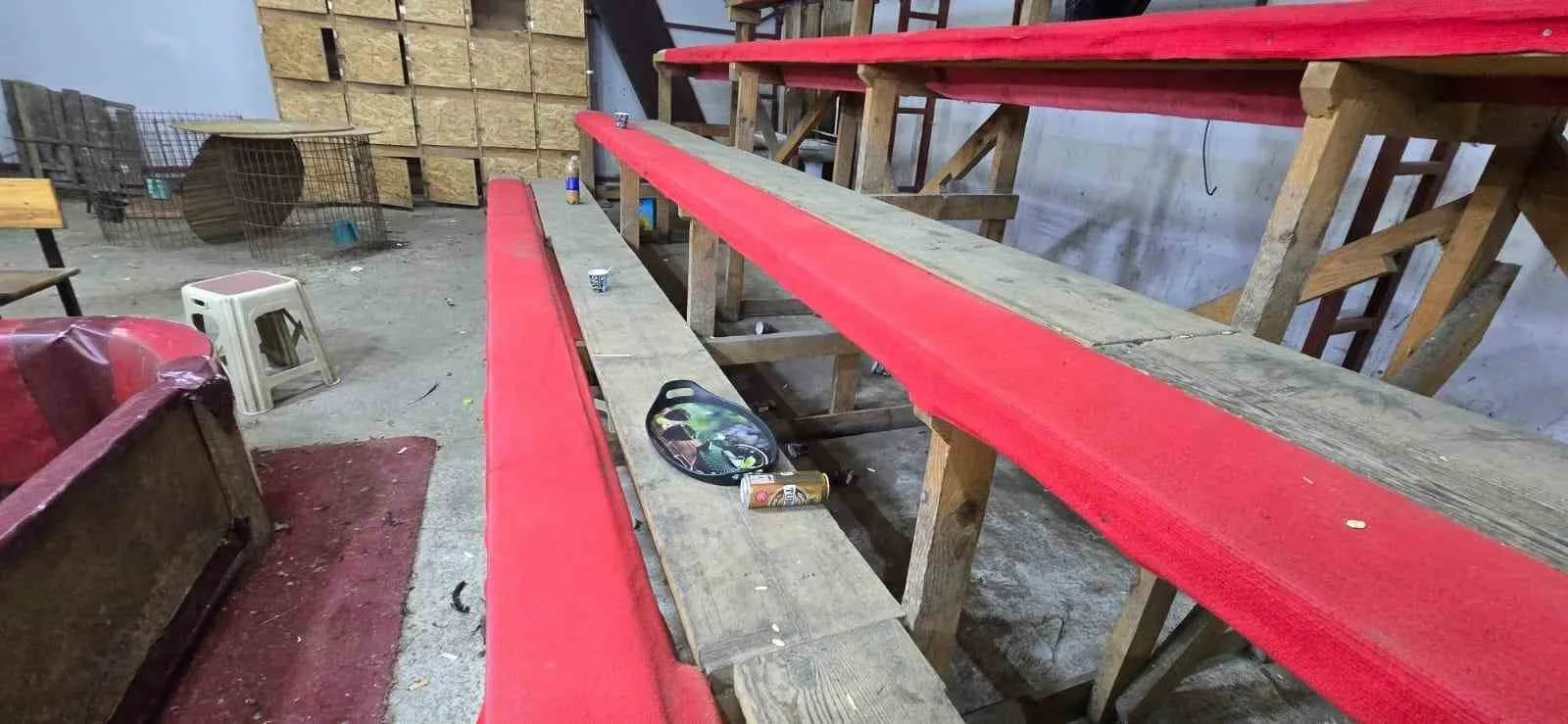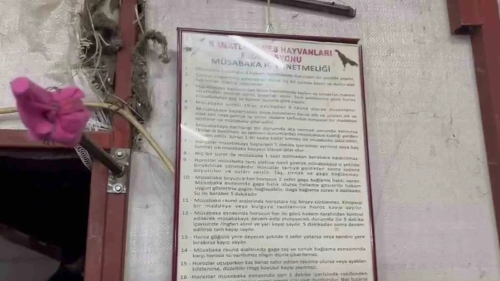 GÖRÜNTÜNÜN DEVAMINDA HOROZLARIN TUTULDUĞU NUMARALARLA KODLANMIŞ KAFESLER, KUPA VE MADALYALAR İLE DUVARA ÇERÇEVELENEN MÜSABAKA YÖNETMELİĞİ DİKKATLERDEN KAÇMADI.