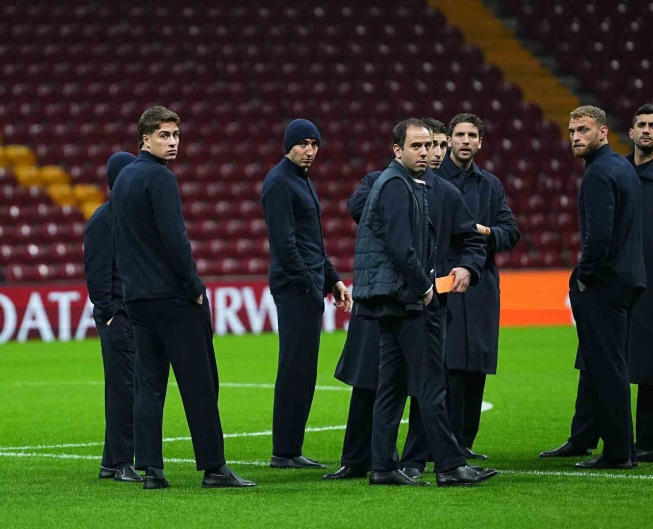 FUTBOLCULAR VE TEKNİK EKİP, BURADA SAHANIN ZEMİNİNİ KONTROL EDERKEN, STADYUMU DA İNCELEDİ.