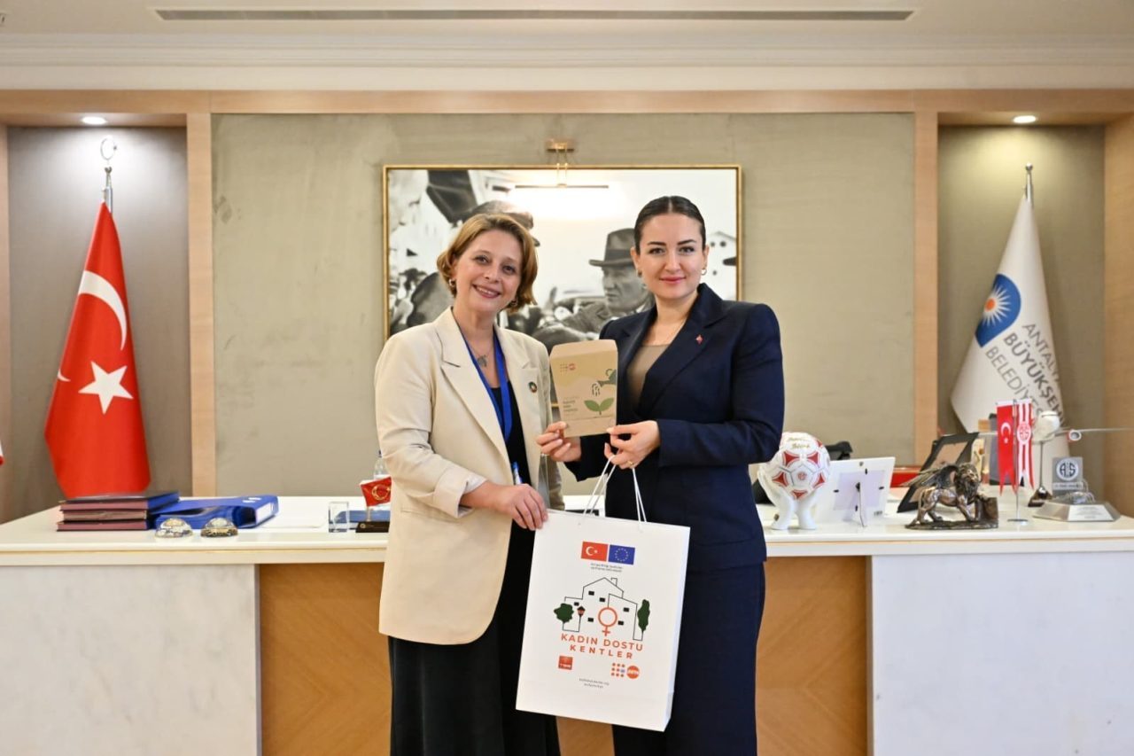 Antalya Büyükşehir Belediyesi, Dışişleri Bakanlığı Avrupa Birliği Başkanlığı koordinasyonunda Avrupa Birliği’nin finansal desteği, Birleşmiş Milletler Nüfus Fonu, UNFPA’in yürütücülüğünde Türkiye Belediyeler Birliği ortaklığıyla yürütülen ‘Kadın Dostu Kentler III’ programı kapsamında çalışmalar sürüyor. Antalya Büyükşehir Belediyesi Başkan Vekili Büşra Özdemir, “Kadın Dostu Kentler III” programı kapsamında Birleşmiş Milletler Nüfus Fonu (UNFPA) yetkilileri ile bir araya geldi. UNFPA Türkiye Kadın Dostu Kentler Programı Yöneticisi Özlem Çalışkan ve Saha Koordinatörü Naz Hıdır ve heyet, Başkan Vekili Özdemir’i ziyaret ederek, yürütülen programı değerlendirdi. Kadın Dostu Kentler III Programı’na 25 pilot ilden biri olarak seçilen Antalya Büyükşehir Belediyesi’nin yaptığı çalışmaların ele alındığı ziyarette, program kapsamında 30 Kasım 2027 yılına kadar yürütülecek faaliyetler konuşuldu.