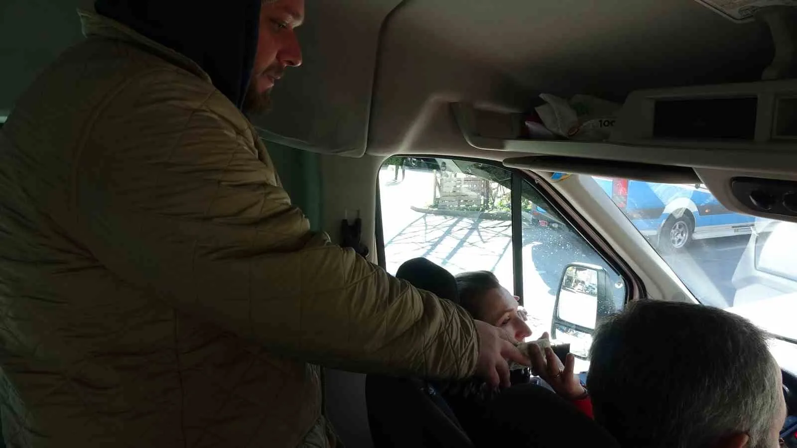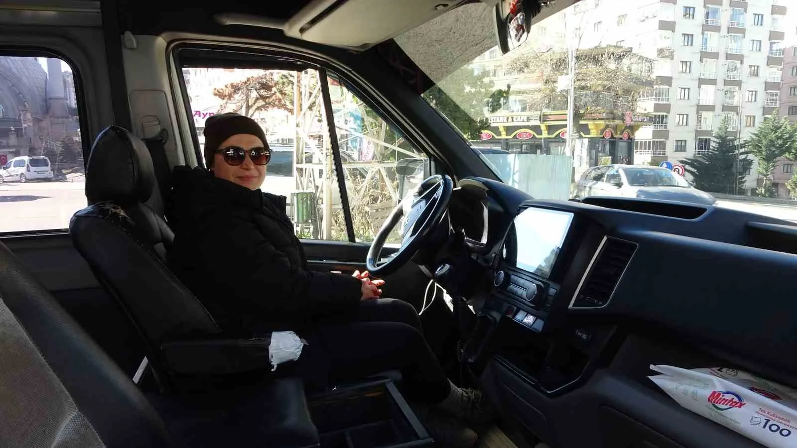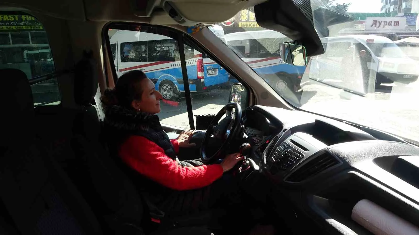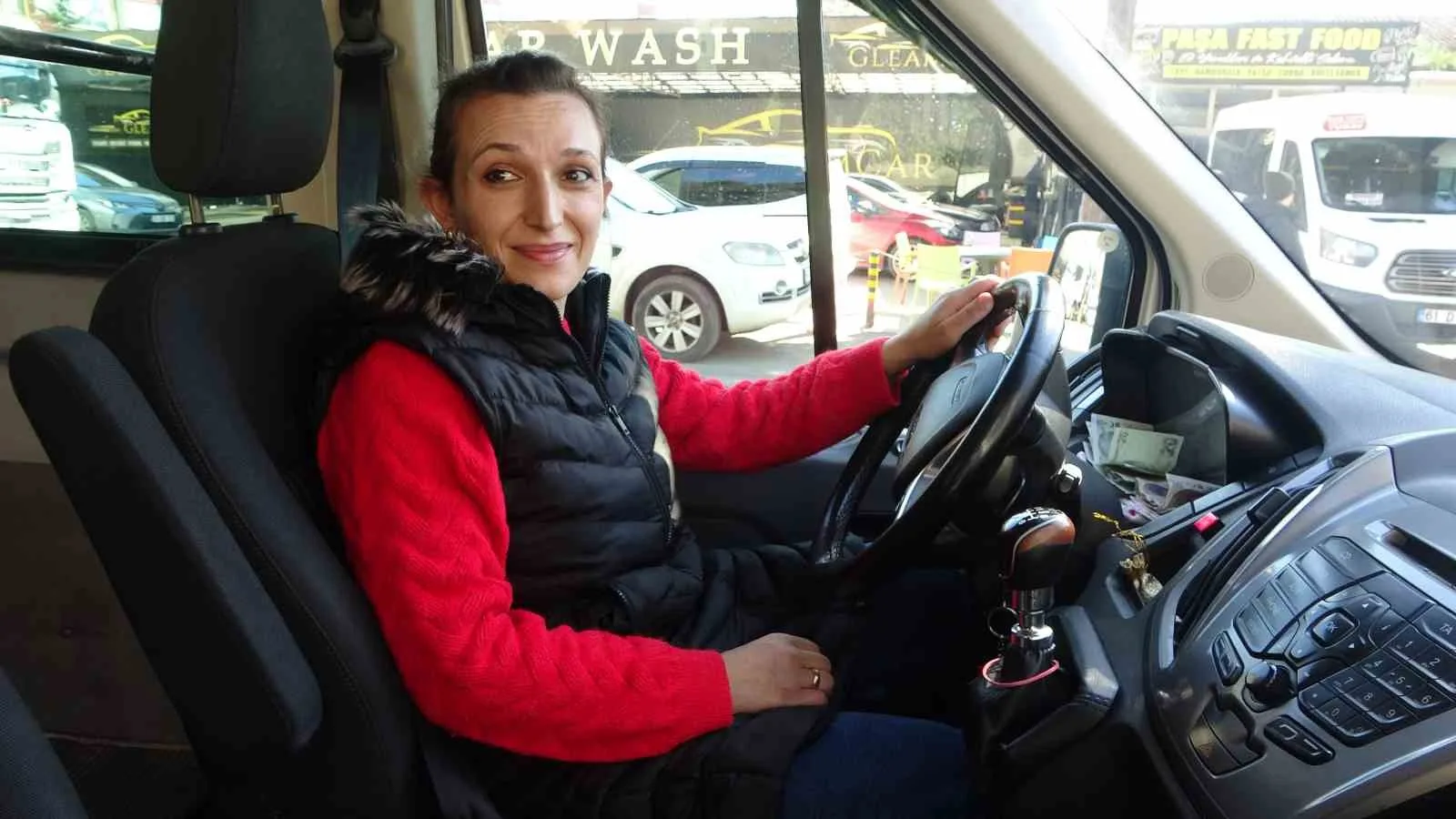 DİLEK KOÇ, TRABZON’UN EN İŞLEK DURAKLARINDAN OLAN BOZTEPE DOLMUŞ DURAĞINDA MİNİBÜSLE YOLCU TAŞIMACILIĞI YAPIYOR.
