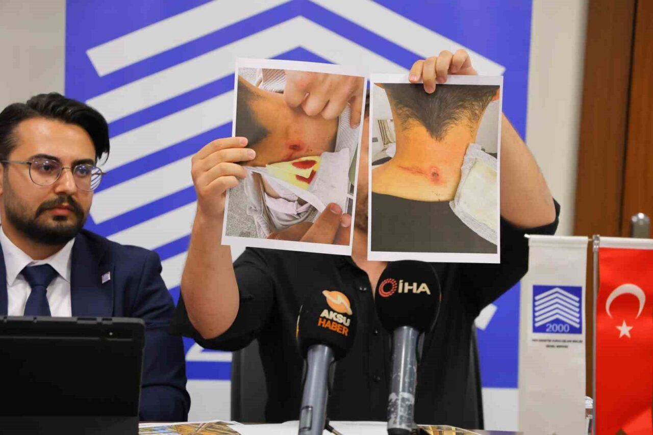 Saldırıya uğrayan firma yetkilisi Tuncay Polat ise “Kamera görüntülerini almak için emniyet mensupları aradılar, ben şantiyeye gittim. Olay yeriyle ilgili video kaydı falan da tekrar almam gerekiyordu çünkü. Şantiyeye gittiğimde yolun karşısında duruyordu saldırgan şahıs. Yani tutuklanmadı. Burada da fotoğraflar mevcut. Yani şu demirler aslında bu saldırıyı yaptıkları, bizi ittikleri, yani saplamaya çalıştıkları demirler bunlar. Kesinlikle öldürmeye yönelik bir hareket. Çünkü iki kere ben can havliyle, el yordamıyla o demirlerden kurtuldum. Birincisinde bu kolumda çizik oluştu. İkincisi de zaten boynumda tam bu omuriliğe yakın bir yerde 5 santimlik bir çizik ve demir içeri girdi. Yani bu demir yarım santim daha içeriden geçmiş olsa zaten şu an sizlerle bu toplantıya katılamıyor olacaktım. Yani ölümcül bir bölgeye çok yakın bir yaralanma aldım. Bu kadar canice bir saldırının konu ne olursa olsun yani ortada bir çelişki yok, tartışma yok. Sadece bizim yapının daha güvenli olmasını, depreme daha dayanıklı olmasını istediğimiz için çıkması bizi korkutuyor. Ve bundan sonraki süreçte bu durum cezasız kalırsa asıl tehlikeli olan durum budur. Biz hangi denetime gitsek bizi bu sefer yeniden tehdit etmeye başlayacaklar. İlla ki sizi mi dövelim, illa ki öldürelim mi kabul edin gitsin. Yani biz burada bir deprem anında hayatların kurtarılması için mücadele ediyoruz” şeklinde konuştu.