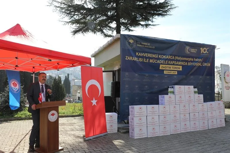 Düzenlenen biyosidal ürün dağıtım etkinliğinde konuşan Trabzon İl Tarım ve Orman Müdürü İsa Kaplan, kahverengi kokarca ile mücadelenin önemini vurgu yaparak “Tarım ve Orman Bakanlığımızın, 2023-2025 Yılı Kahverengi Kokarca İle Mücadele Eylem Planı doğrultusunda başlattığı bu önemli mücadelenin bir parçası olmak, hepimiz için büyük bir gurur kaynağıdır. Kahverengi kokarca zararlısı, özellikle son yıllarda ülkemizde ciddi riskler oluşturmuş ve bu zararlının yayılımı, tarımda büyük kayıplara yol açmıştır. Bu kapsamda, bakanlığımız tarafından başlatılan mücadele çalışmaları, her geçen yıl daha da güçlenmiş ve önemli başarılar elde edilmiştir. 2007 yılından itibaren izlenen stratejiler, bu zararlının popülasyonunu kontrol altına almak için büyük bir titizlikle uygulanmış ve şu ana kadar önemli adımlar atılmıştır. Üreticilerimize dağıttığımız 5 bin adet biyosidal ürünle, bu mücadelede daha da güçlü bir adım atmış bulunuyoruz. Ayrıca biyolojik mücadele kapsamında 2024 yılında doğaya bırakılan 10 bin adet samuray arısı, bu yıl 50 bin adede çıkartılacaktır. Bu, doğa dostu bir yaklaşımın ne kadar etkili ve verimli olduğunu bir kez daha gözler önüne sermektedir. Biyoteknik mücadele konusunda yapılan çalışmalar da takdire şayandır. 600 lokasyona yerleştirilen feromon tuzakları ile zararlı popülasyonları önemli ölçüde azaltılmış ve yalnızca 10,5 litre zirai ilaç kullanımı ile bu mücadelenin sürdürülebilirliği sağlanmıştır. Bu da, çevreye duyarlı bir yaklaşımın ne kadar önemli olduğunu bizlere göstermektedir. Bu mücadeledeki başarı, yalnızca kamu kurumlarının çabalarıyla değil, aynı zamanda üreticilerimizin ve tüm paydaşlarımızın katkılarıyla mümkün olmuştur. Üreticilerimizin desteği olmadan bu başarıyı elde etmek çok daha zor olurdu. Hep birlikte, daha sağlıklı ve verimli bir tarım geleceği inşa etmek için el birliğiyle çalışmamız gerektiğinin bilincindeyiz” dedi.