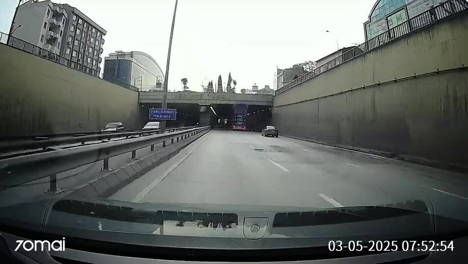 Kocaeli’de kapağı açık halde seyir halinde olan kamyon tehlike saçtı. Durumu fark edemeyen sürücü, D100 Karayolu Derince Tüneli’nden geçerken kaza yaptı. Kapağın tünele çarpması ile araç ve tünelde hasar meydana geldi. Çarpmanın şiddetiyle durumu fark eden sürücü aracı sağ şeride çekerek durdurdu. O anlar seyir halinde olan aracın kamerasına yansıdı.