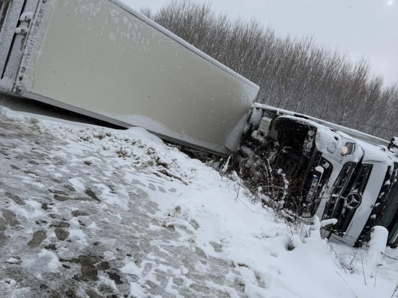 Kastamonu’da kar yağışı sebebiyle devrilen tırın sürücüsü yara almadan kurtuldu.