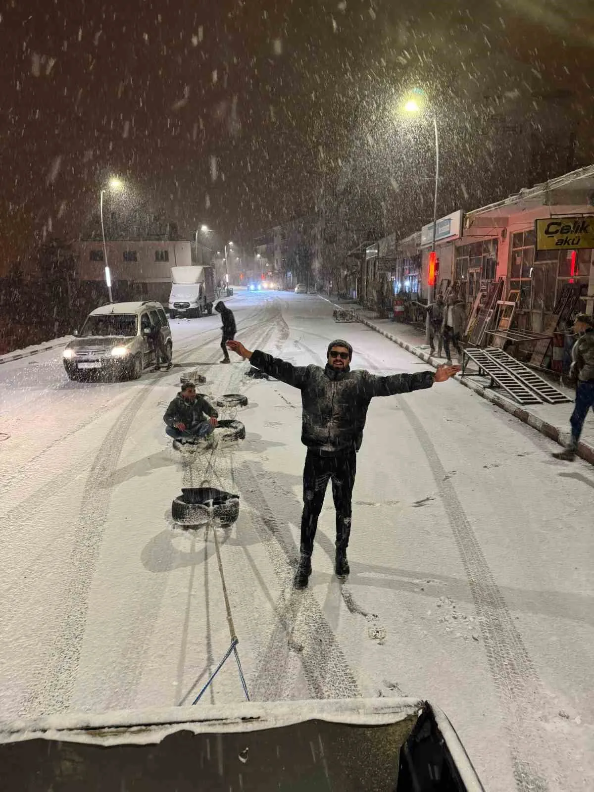 Gümüşhane’de kar yağışını fırsat bilen bir arkadaş grubu pikabın arkasına bağladıkları araç lastikleriyle tüm ilçeyi turlayarak eğlenceli dakikalar geçirdi.