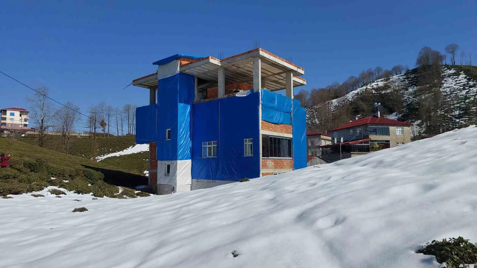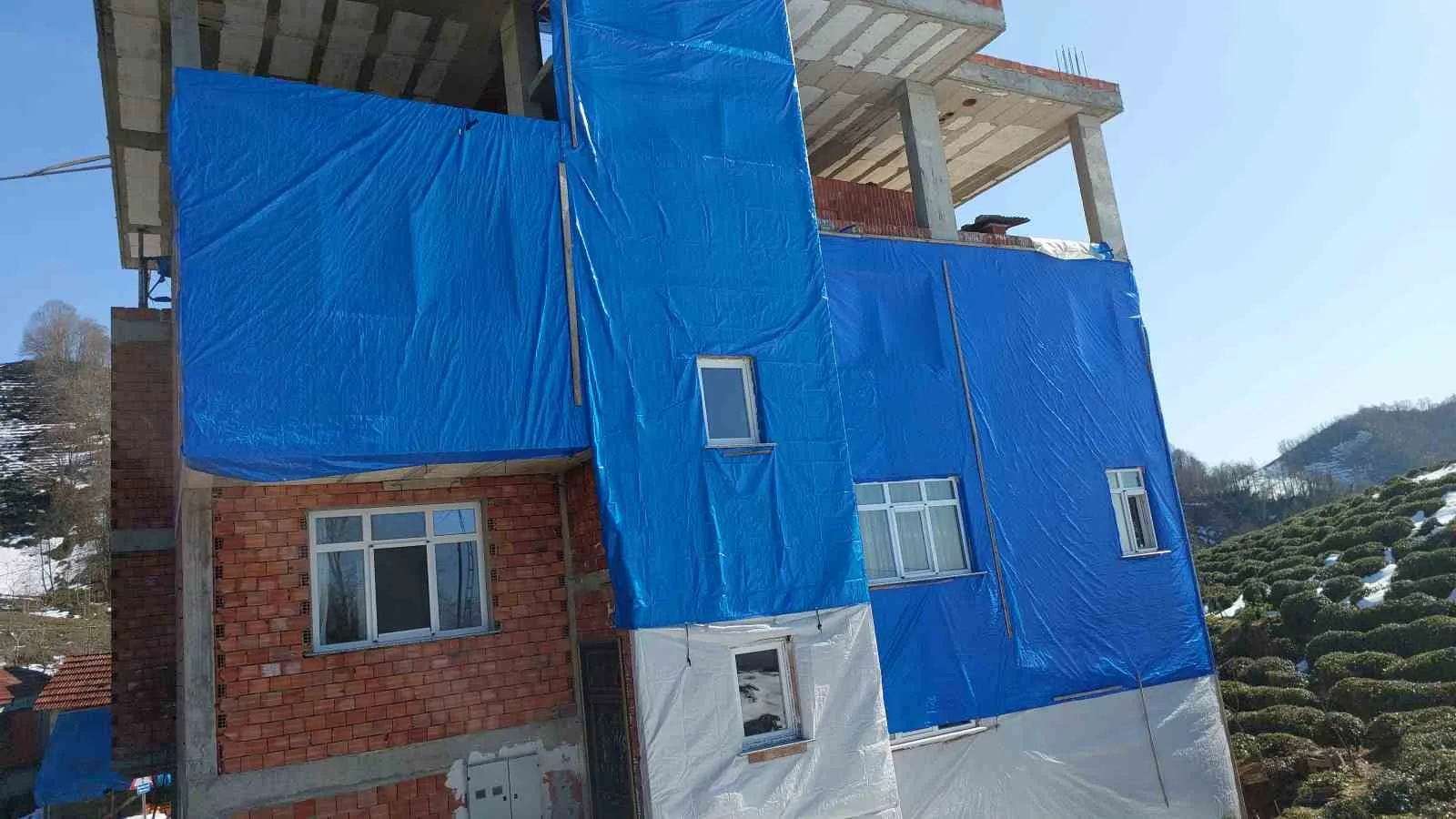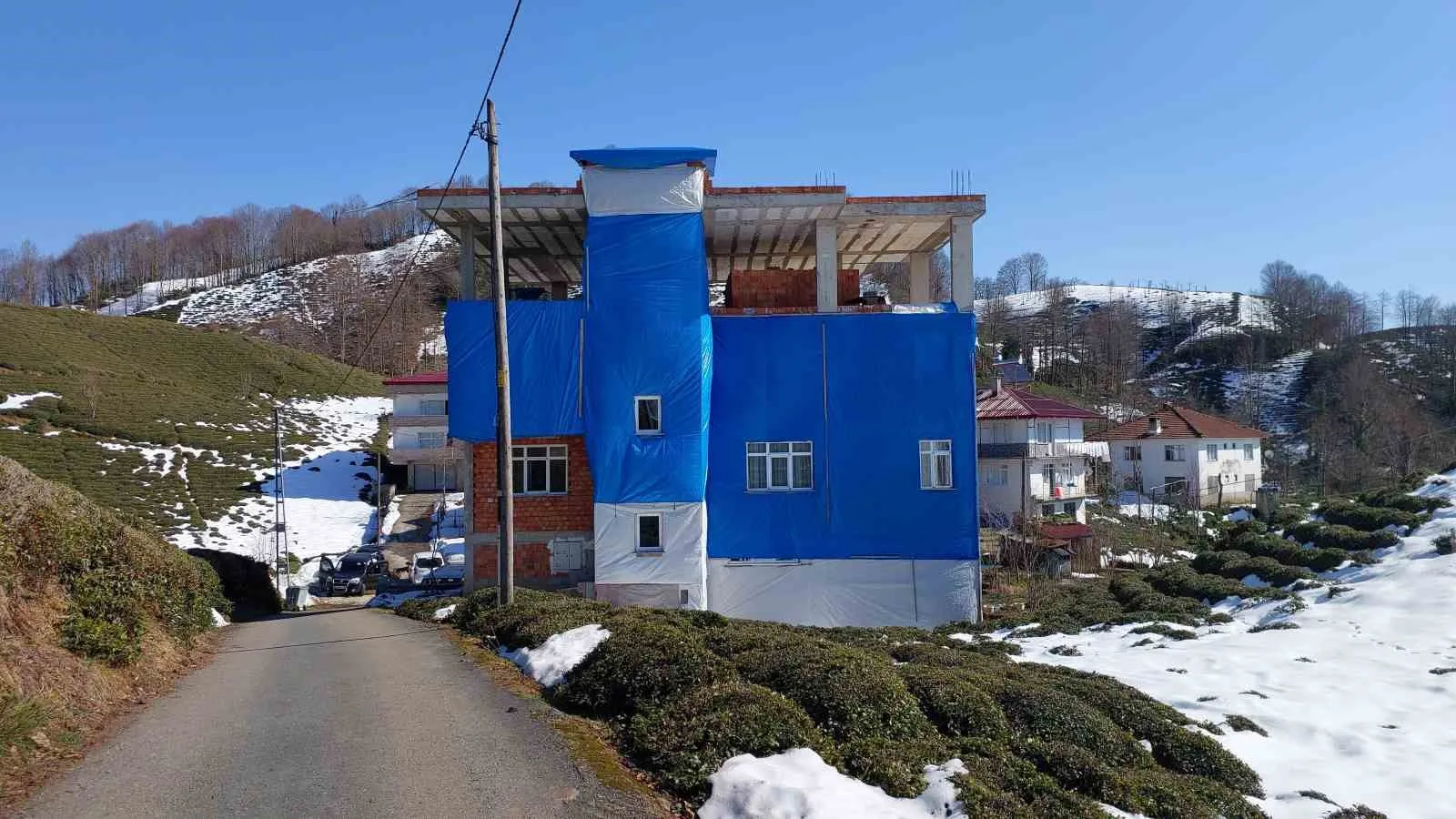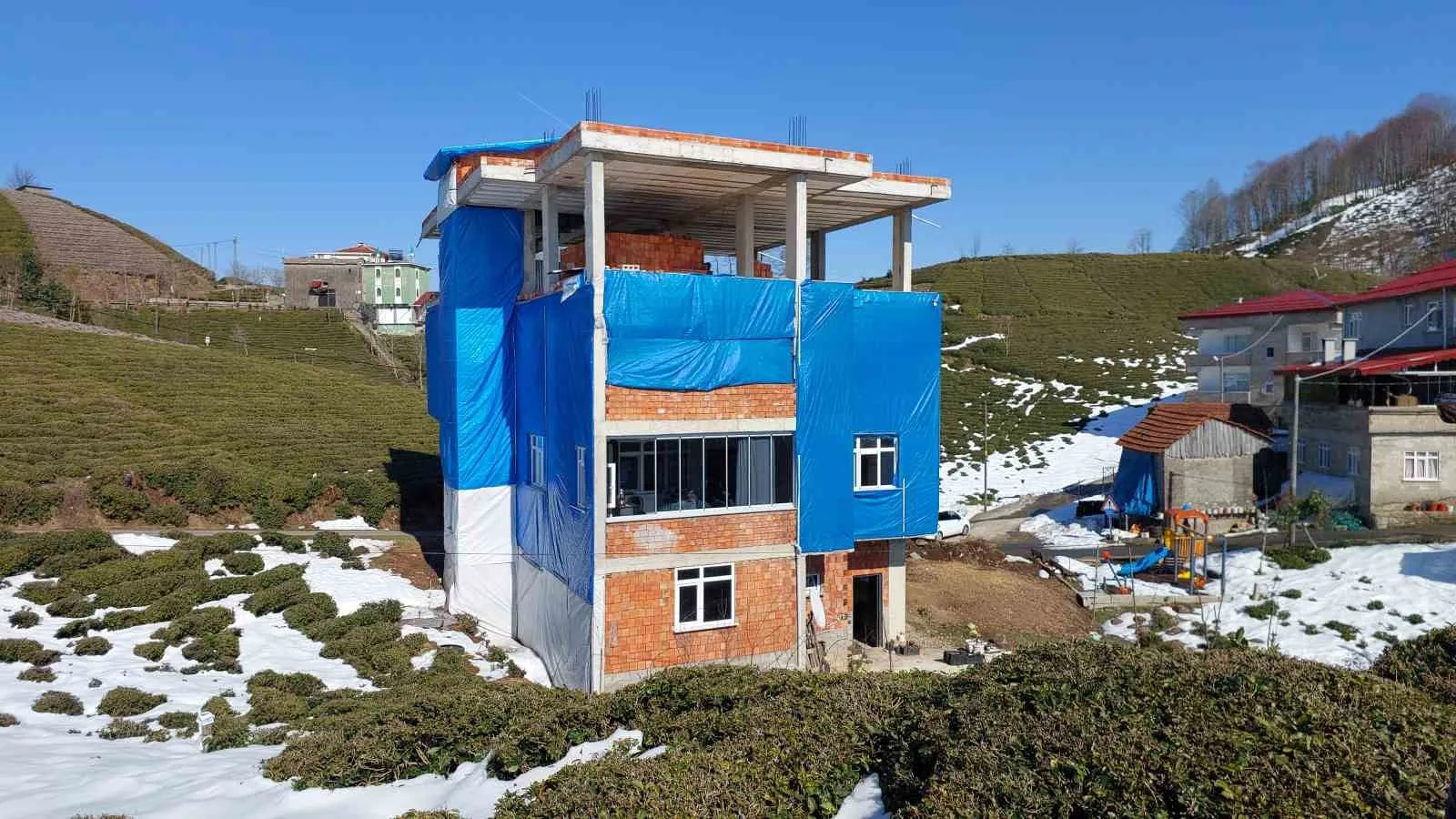 Rize’de bir vatandaş yeni yaptırdığı evinin dışını yağmurdan ve soğuktan korumak için branda ile kaplayarak geçici bir mantolama yaptı.