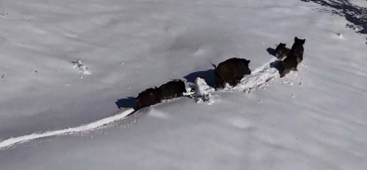 Erzincan merkeze bağlı Kalecik köyü yakınlarına kadar gelen yaban domuzu sürüsü, açık arazide karda ilerlerken görüntülendi. Bölgeye yakın Çağlayan Beldesinde yaşayan Murat Aydemir, karla kaplı alanlarda hareket eden domuz sürüsünü fark ederek drone ile takibe başladı.