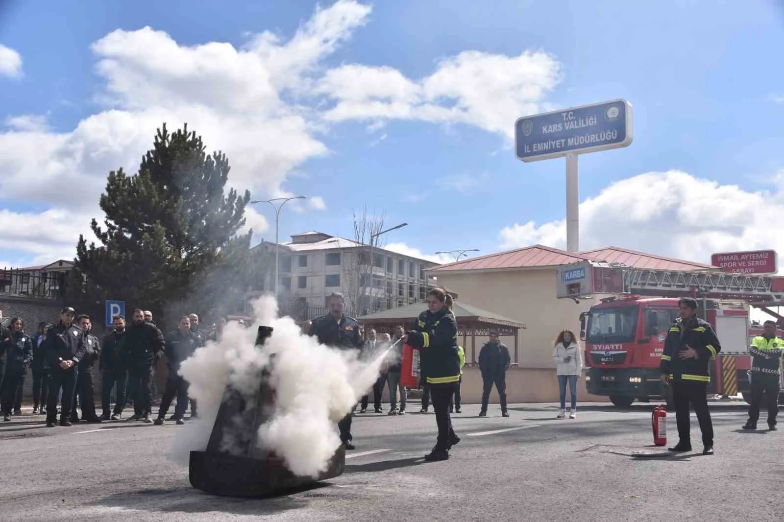 Kars Emniyet Müdürlüğü’nde gerçekleştirilen yangın tatbikatı, gerçeği aratmadı. Senaryo gereği çıkan yangına ekipler anında müdahale ederken, binada mahsur kalan personelin tahliyesi ise nefesleri kesti.