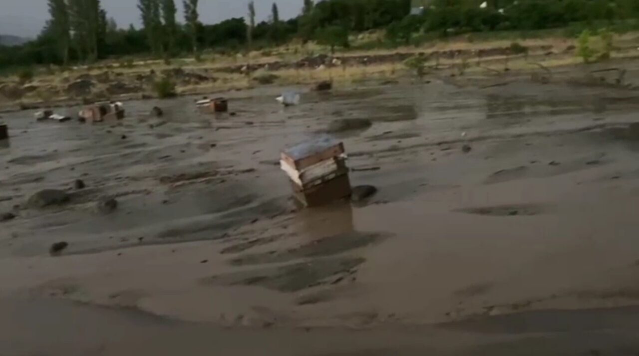 Kars’ta etkili olan sağanak yağış sele neden oldu, sel suları arı kovanlarını sürükledi.