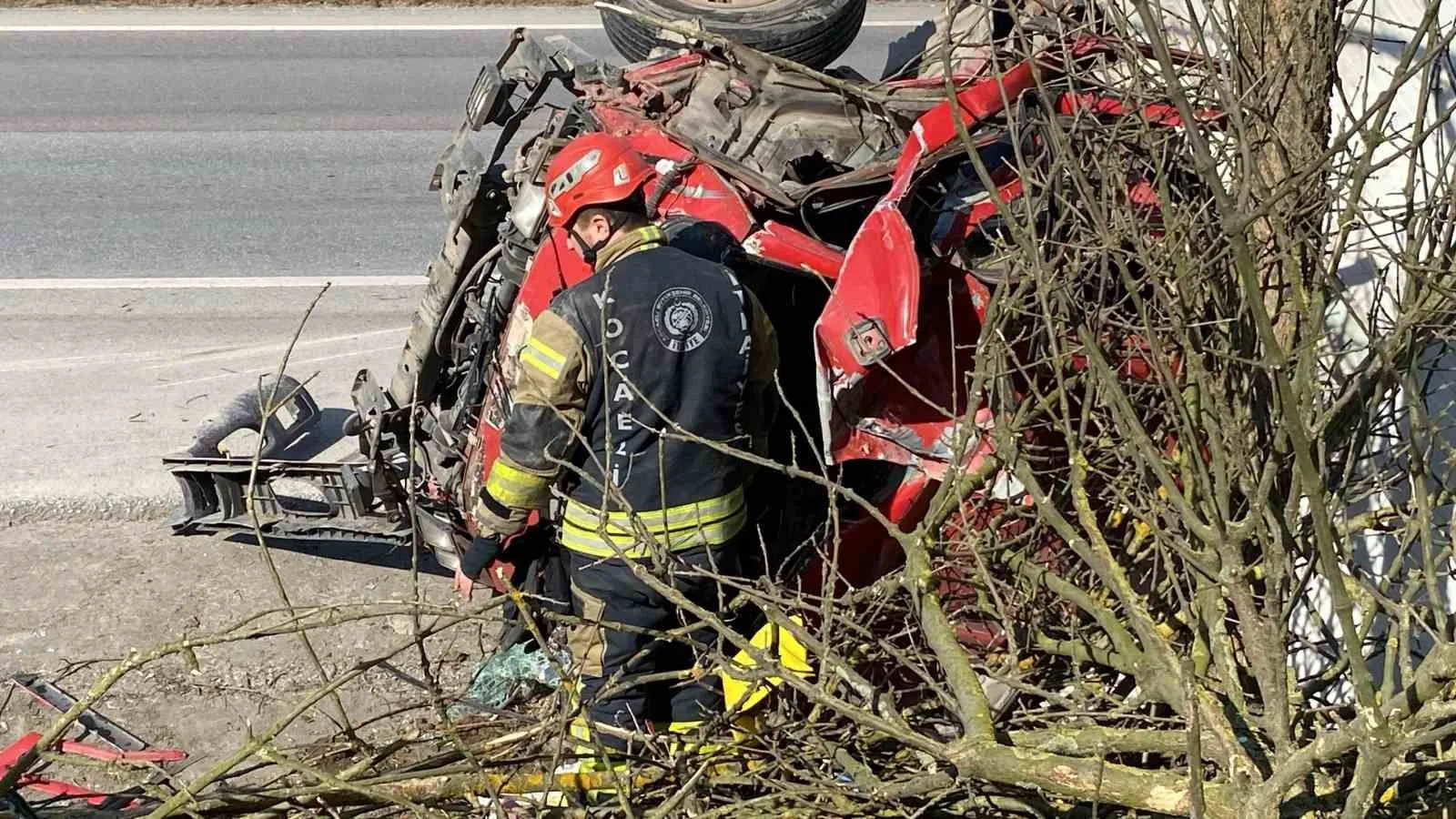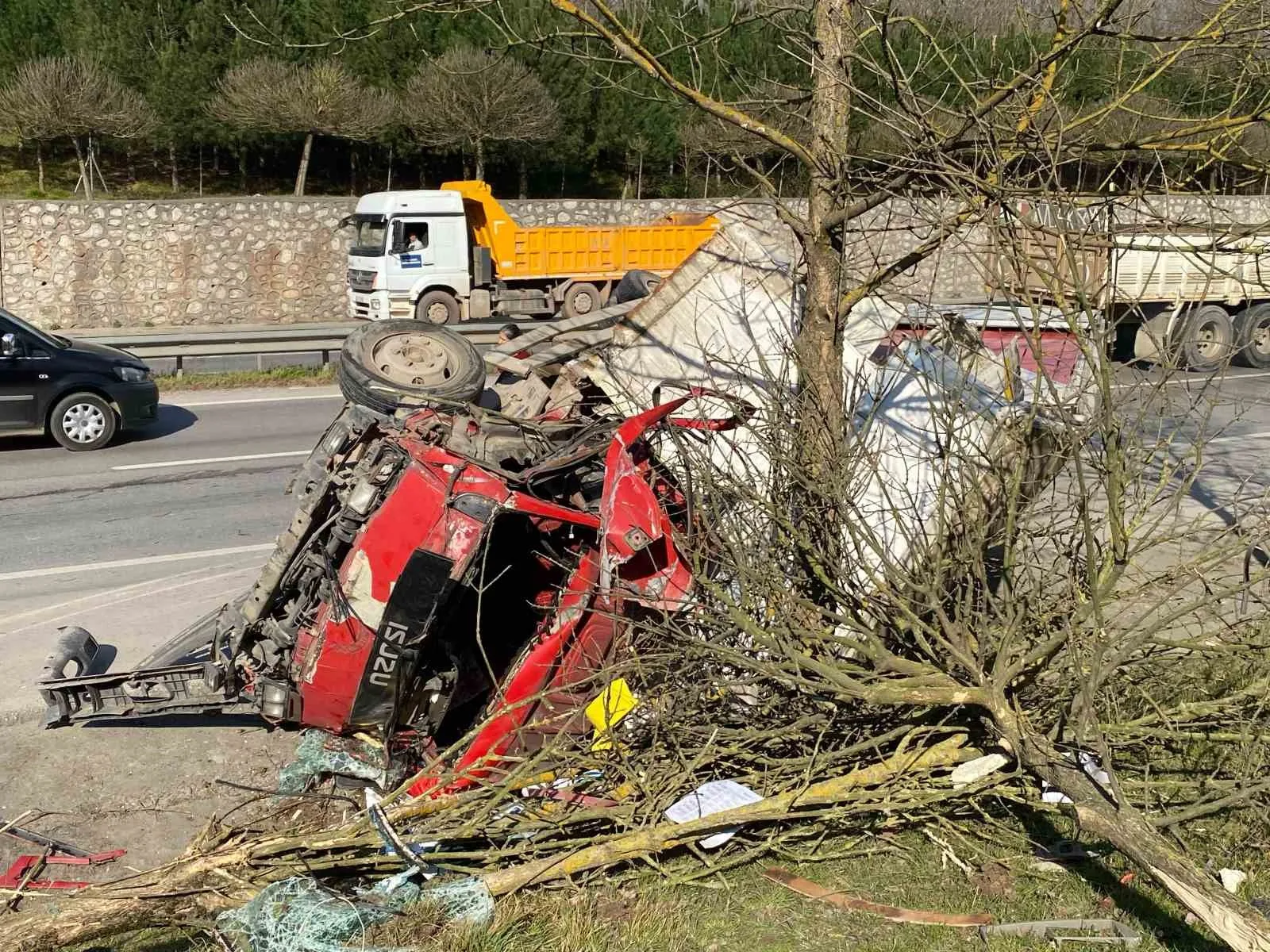 Kocaeli’nin Kartepe ilçesinde kontrolden çıkan kamyonet ağaçları devirerek yol kenarına uçtu. Kamyonetin kağıt gibi ezildiği kazada 2 kişi yaralandı.
