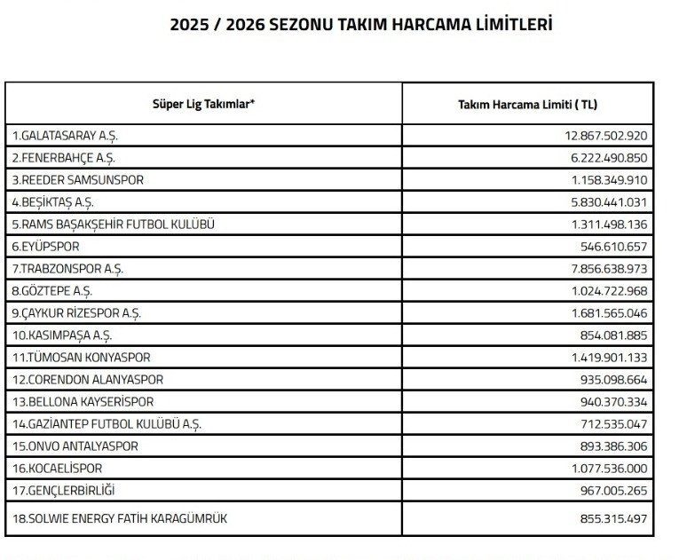 Türkiye Futbol Federasyonu (TFF) Süper Lig takımları için 2. transfer ve tescil dönemi harcama limitlerini açıkladı. TFF’nin resmi internet sitesinden yapılan açıklamada Kulüp Lisans Kurulu, 2025-2026 Sezonu Süper Lig Takım Harcama Limitleri’ni ikinci transfer ve tescil dönemi ile ilgili olarak belirlendiği belirtildi.