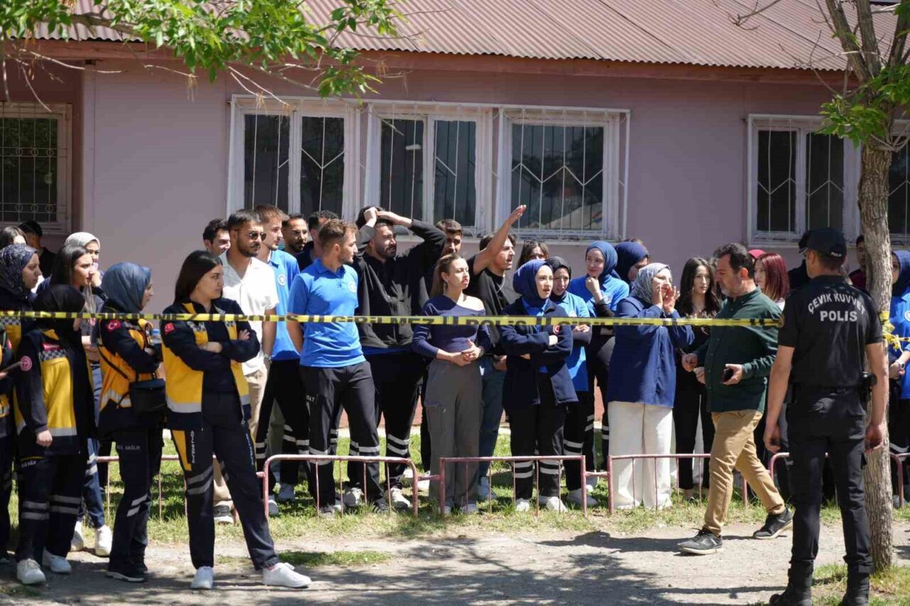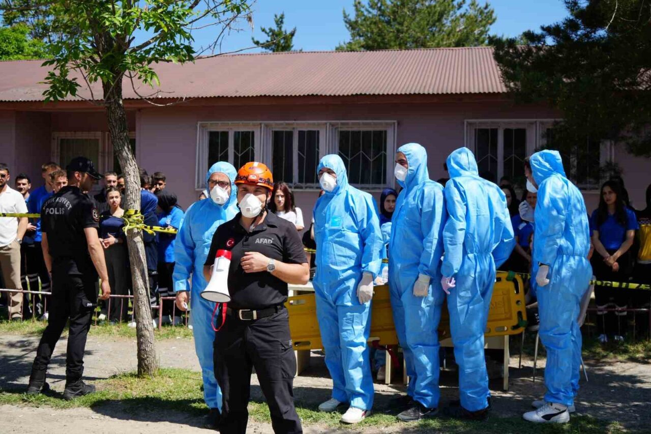 EBYÜ Sağlık Hizmetleri Meslek Yüksekokulu içeresinde kimyasal madde sızıntısının meydana gelmesiyle başlayan tatbikatta rol gereği kimyasal gazdan etkilenen öğrencilerin tahliyesi ve baygınlık geçiren öğrencilere ekiplerin müdahalesi nefesleri kesti.