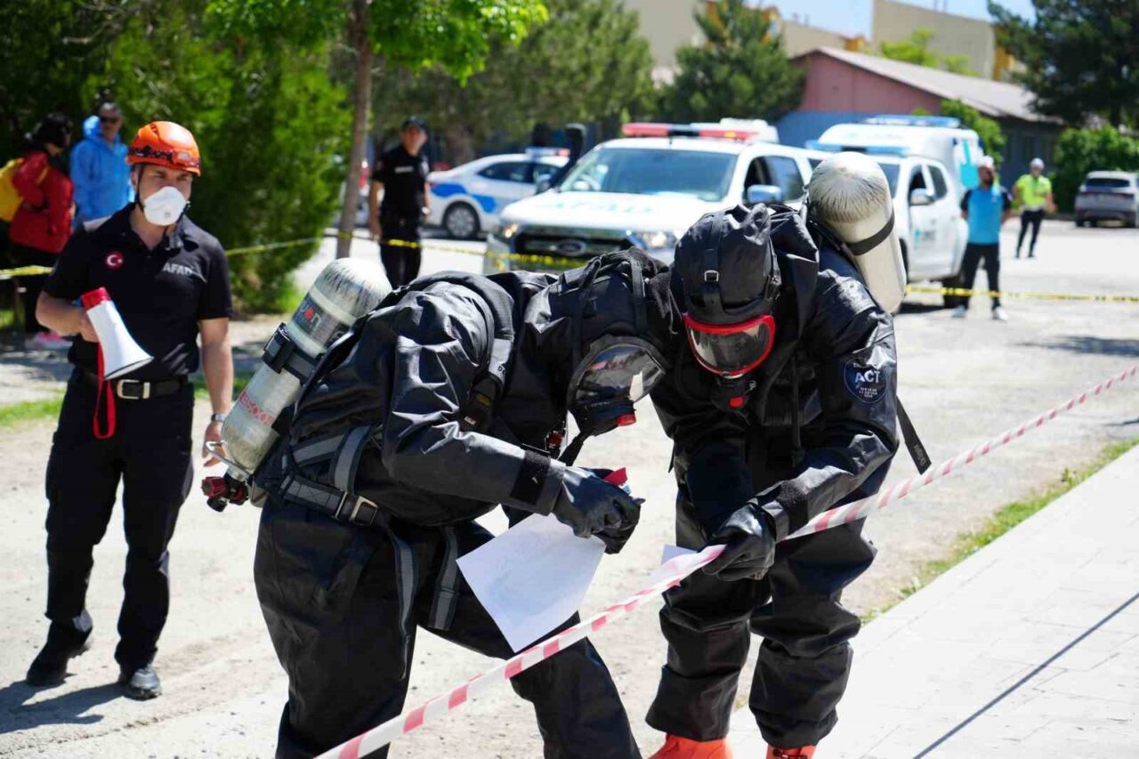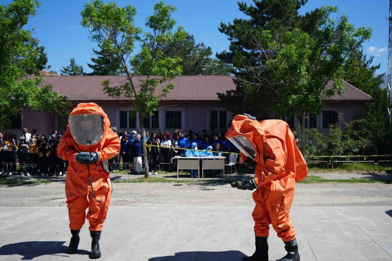 Tatbikatta A tipi KBRN kıyafeti giyen ekipler alanda ölçüm yaptı ardından sızıntıdan etkiklenen 2 öğrenciye müdahale etti.