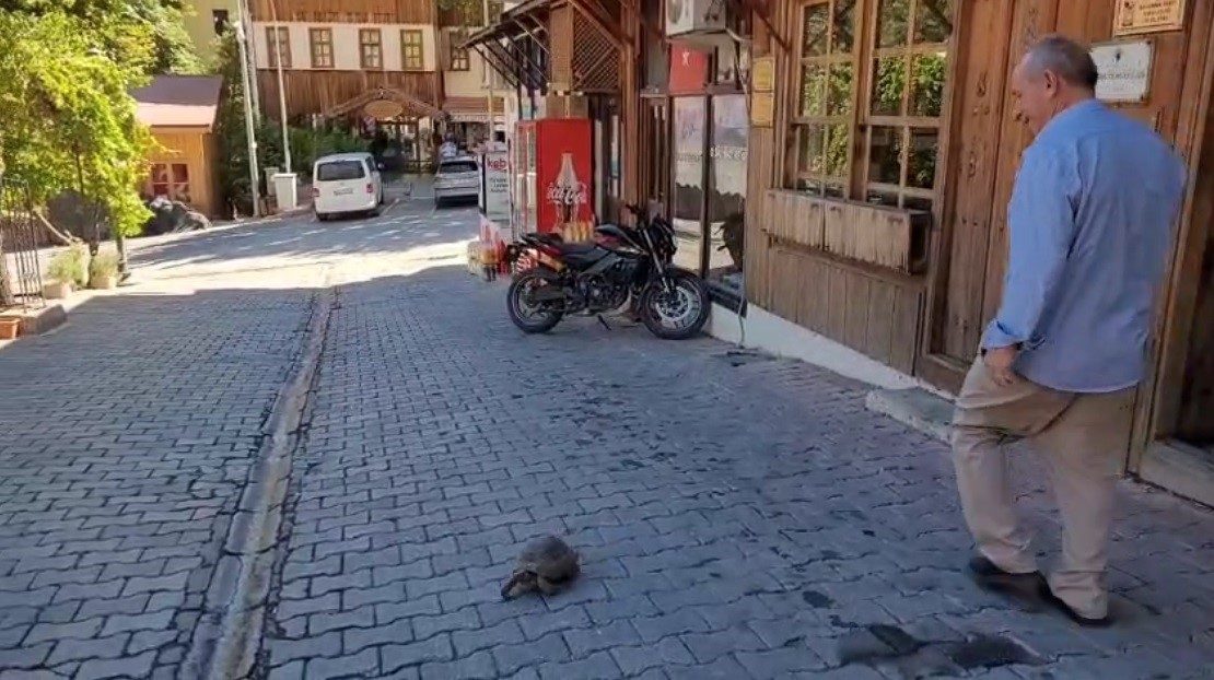 Sakin şehir anlamına gelen Cittaslow kentleri arasında yer alan Erzincan’ın Kemaliye ilçesinde sokaklarda özgürce dolaşan kaplumbağa ilgi odağı oldu.