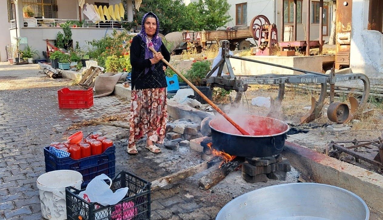 Kadınlar, sıra sıra koydukları kazanlarda odun ateşinin üzerinde kaynattıkları domateslerle kışlık salça yapıyor. Yapımı oldukça zahmetli olan ve 3-4 saat odun ateşinde pişirilerek elde edilen salça, cam kavanozlara konularak kış boyu tüketiliyor.