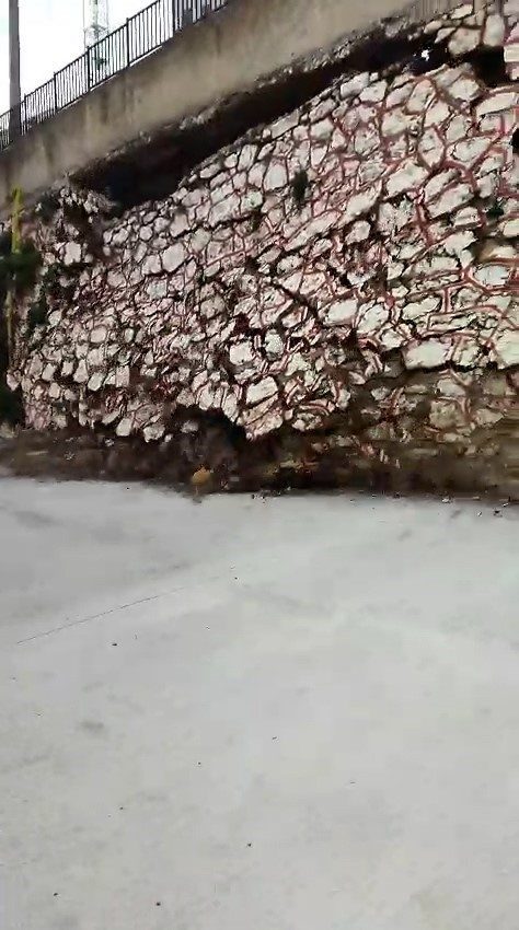 İstinat duvarının okul bahçesine devrildiği anlar ise o sırada bölgede bulunan bir vatandaş tarafından saniye saniye kaydedildi. Taş blokların lise bahçesine yığıldığı anları görüntüleyen vatandaş, “Gördüğünüz üzere komple duvar yıkıldı, kendiliğinden” dedi.