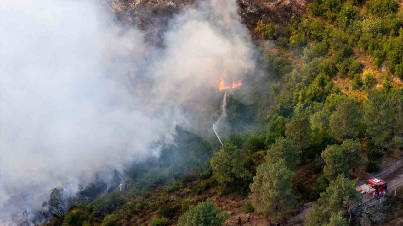 Yenikent Mahallesi’ndeki ormanlık alanda saat 15.00 sıralarında çıkan orman yangınına havadan ve karadan müdahale çalışmaları sürüyor. 61 araç ve 141 personelle yapılan müdahaleler devam ederken, yangının etkili olduğu alanlar dron ile havadan görüntülendi.
