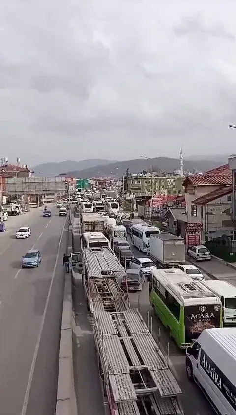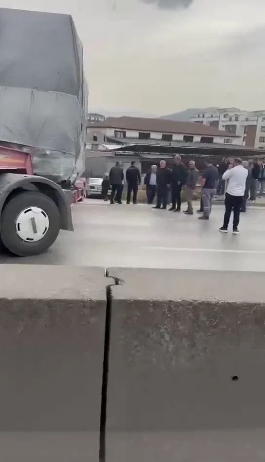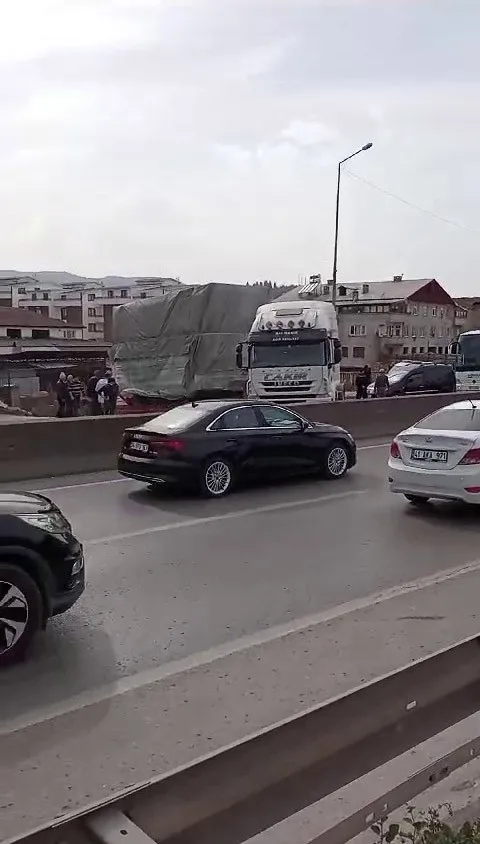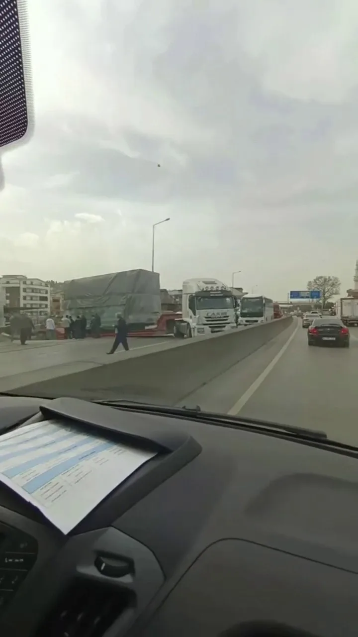 Kocaeli’nde tali yoldan ana yola çıkmak isteyen tırın dorsesi askıda kaldı. Bursa-Kocaeli yolu trafiğe kapanırken, uzun kuyruklar oluştu.