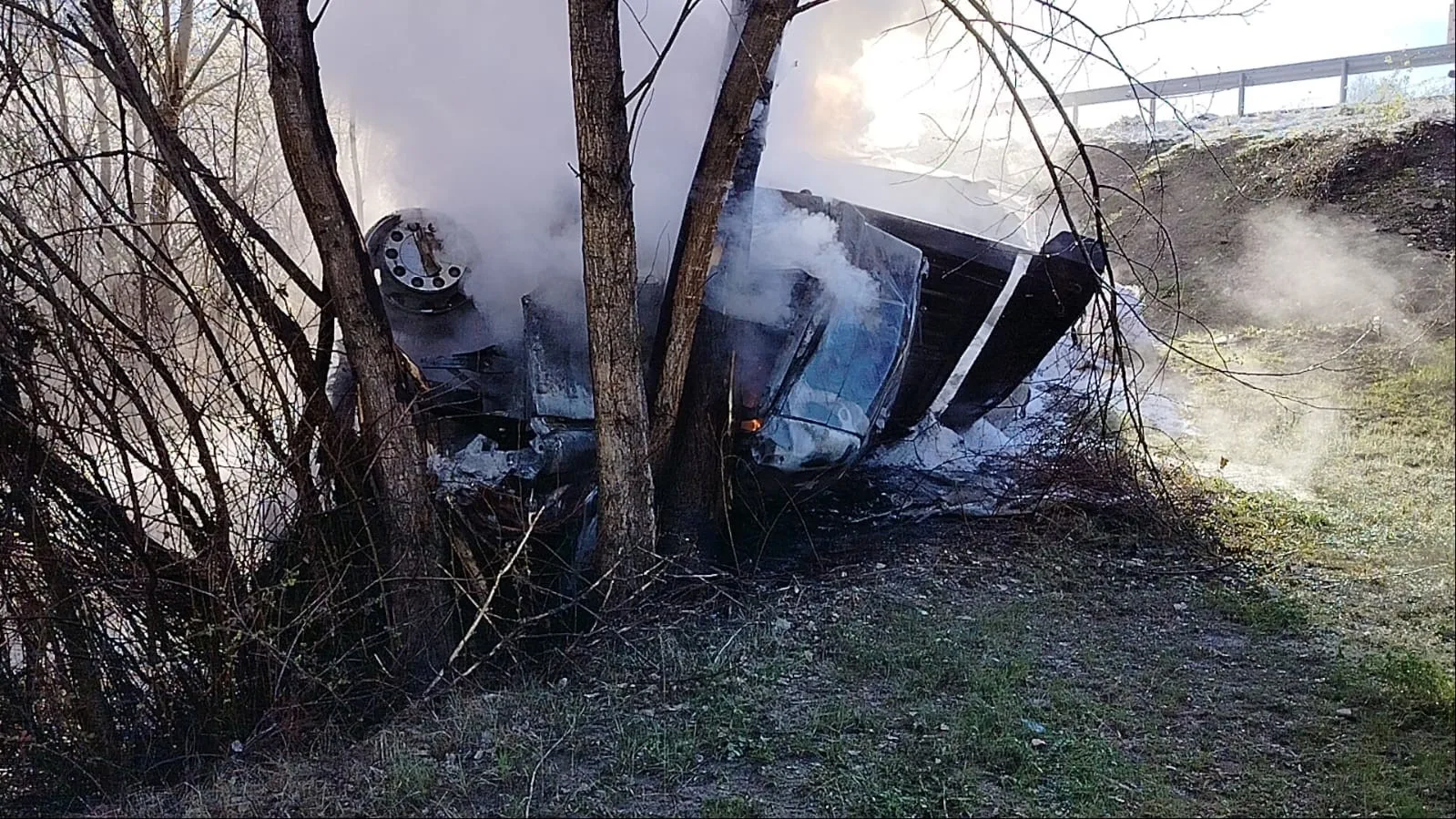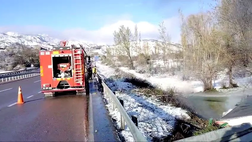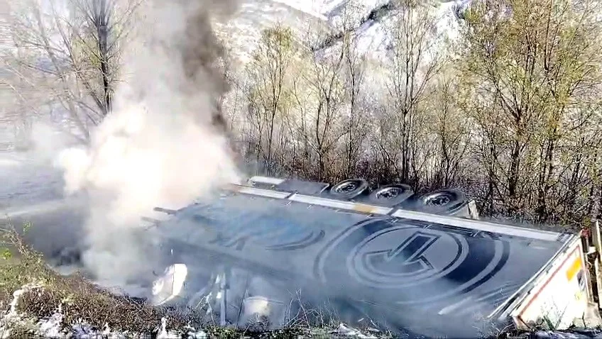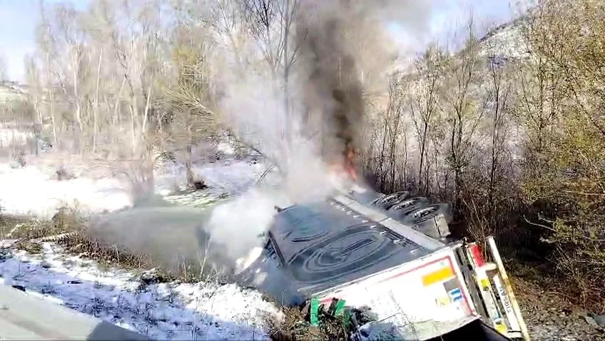 Sivas’ta kontrolden çıkarak yol kenarına devrilen tır, alev aldı. Feci kazada tır sürücüsü hayatını kaybetti.