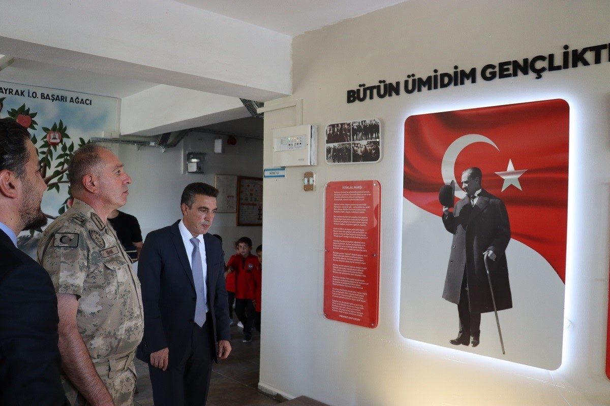 YENİ YAPILAN ATATÜRK KÖŞESİ, ERZİNCAN İL JANDARMA KOMUTANI TUĞGENERAL VEYSEL YANIK VE BERABERİNDEKİ HEYET İLE BİRLİKTE ÜZÜMLÜ İLÇE MİLLİ EĞİTİM MÜDÜRÜ ŞİNASİ YILDIRIM, KARAKAYA KÖYÜ GÖKBAYRAK İLKÖĞRETİM OKULU ÖĞRENCİ VE ÖĞRETMENLERİNİN KATILIMIYLA AÇILDI