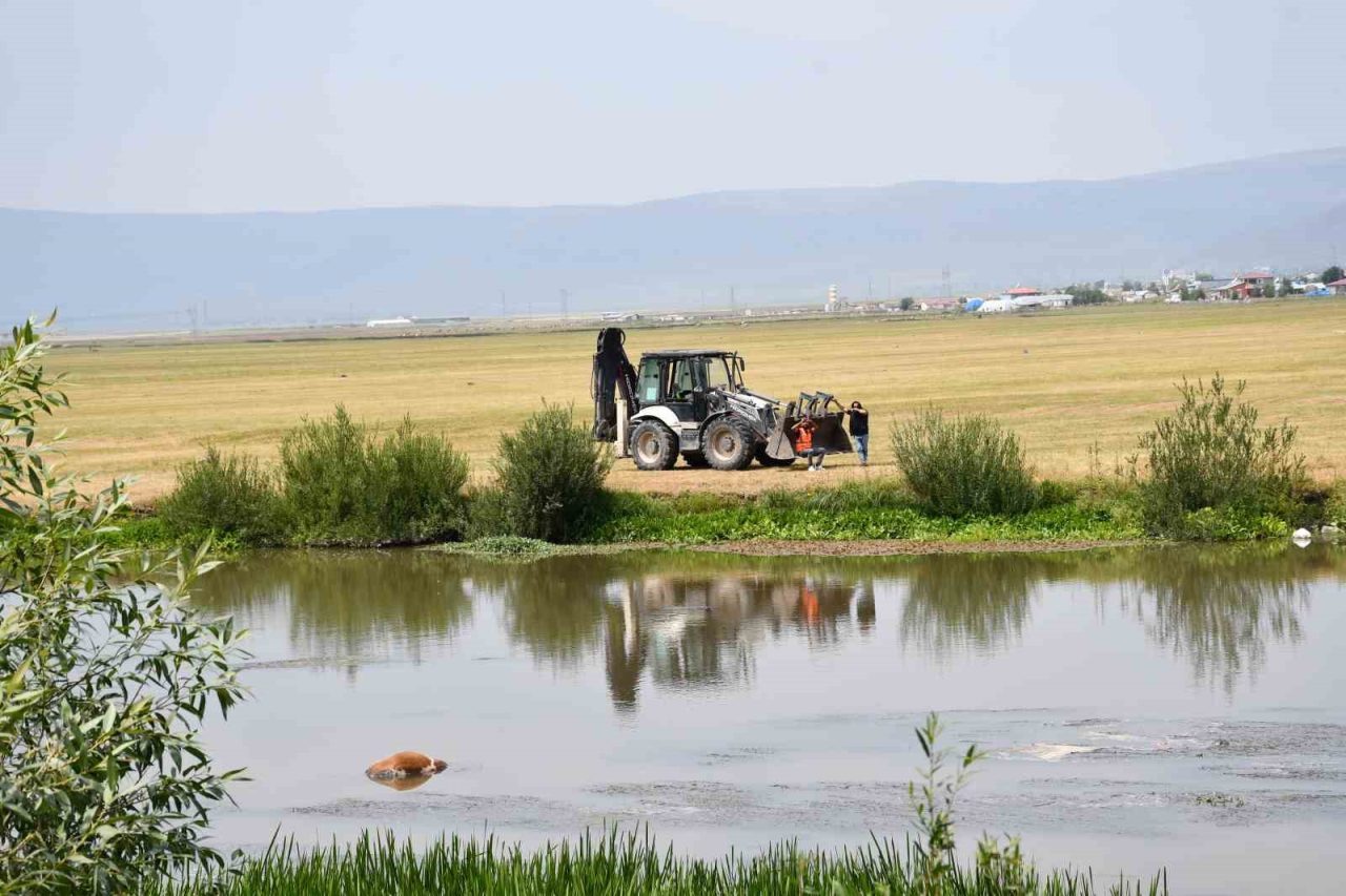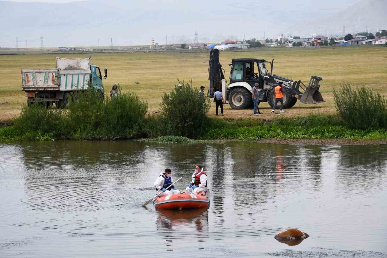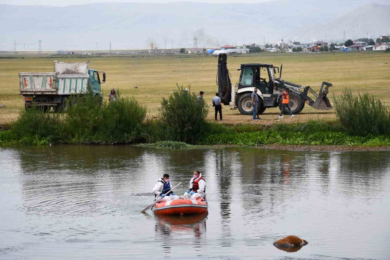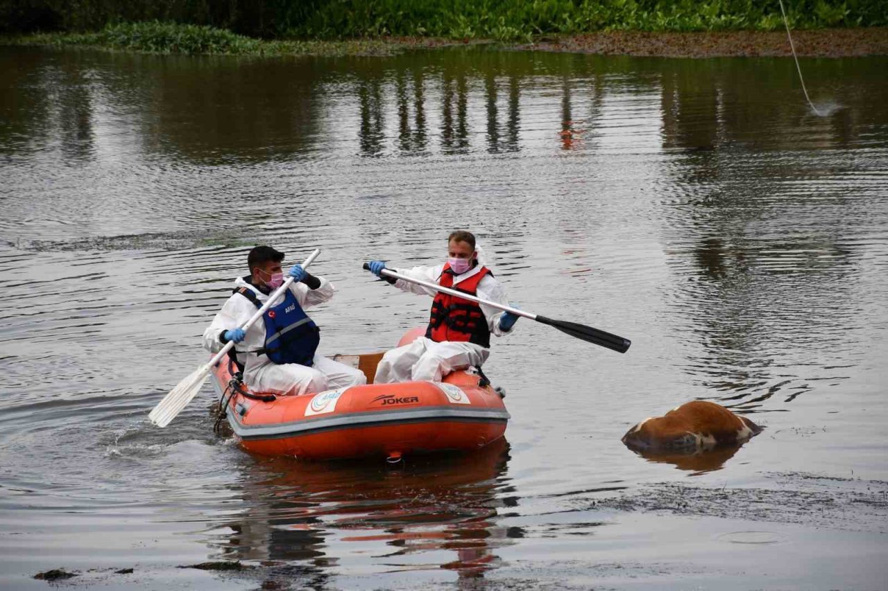 AFAD arama ve kurtarma ekibi, bot yardımıyla boğularak ölen hayvanı sudan çıkarmak için çalışma başlattı.