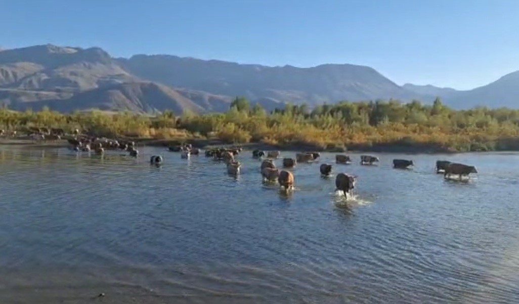 Erzincan’ın Büyük Kadağan köyü mevkiinde otlaktan dönen büyükbaş hayvanlar, su seviyesinin azalmasıyla birlikte Karasu Nehri’ni yürüyerek geçmeye başladı. Normalde köprü üzerinden geçen hayvanların bu kez nehri yürüyerek aşması, kuraklığın boyutunu gözler önüne serdi.