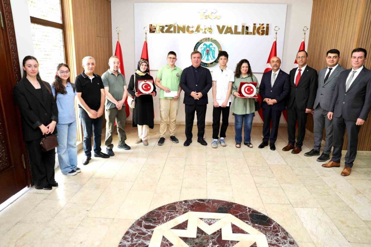 Erzincan Valisi Hamza Aydoğdu; İl Milli Eğitim Müdürü Hacı Ömer Kartal’ı, 2025 LGS’de tüm soruları doğru yanıtlayarak 500 tam puanla Türkiye birincisi olan öğrenciler Mustafa Selim Kağan ve Kaan Ölmez’i, ailelerini ve okul yöneticilerini makamında kabul etti.