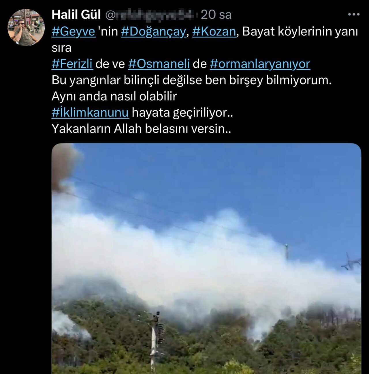 Diğer paylaşımında Gül’ün, “Geyve’nin Doğançay, Kozan, Bayat köylerinin yanı sıra Ferizli’de ve Osmaneli’de ormanlar yanıyor. Bu yangınlar bilinçli değilse ben bir şey bilmiyorum. Aynı anda nasıl olabilir. İklim kanunu hayata geçiriliyor. Yakanların Allah belasını versin” yazdığı görüldü.